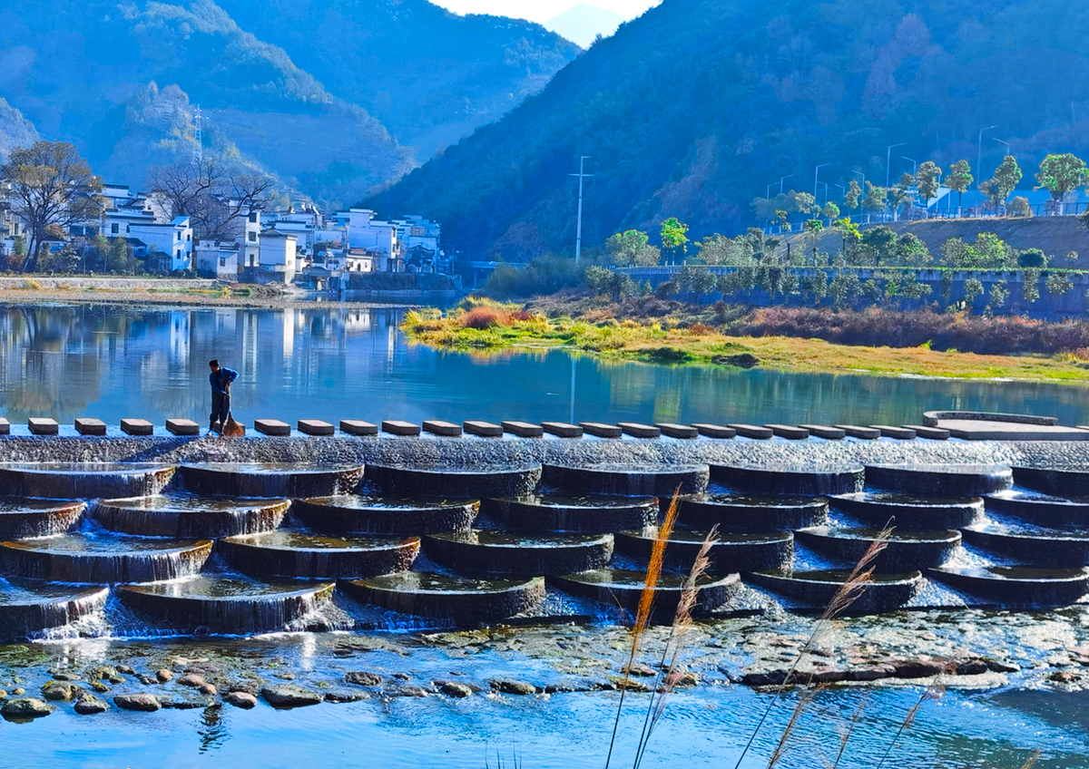 最后路过的皖南歙县三阳镇鱼鳞坝,我们停车驻足,在此网红打卡胜地——鱼鳞坝,放眼望去,水面不宽,流水缓慢,水流跌入弧形鳞片中,形成一朵朵水花。很美! 侧耳倾听,水声潺潺,涓涓流淌,似乎在迎送来往行人。坝顶还设置了汀步,行人可跨步而过,别有情趣。