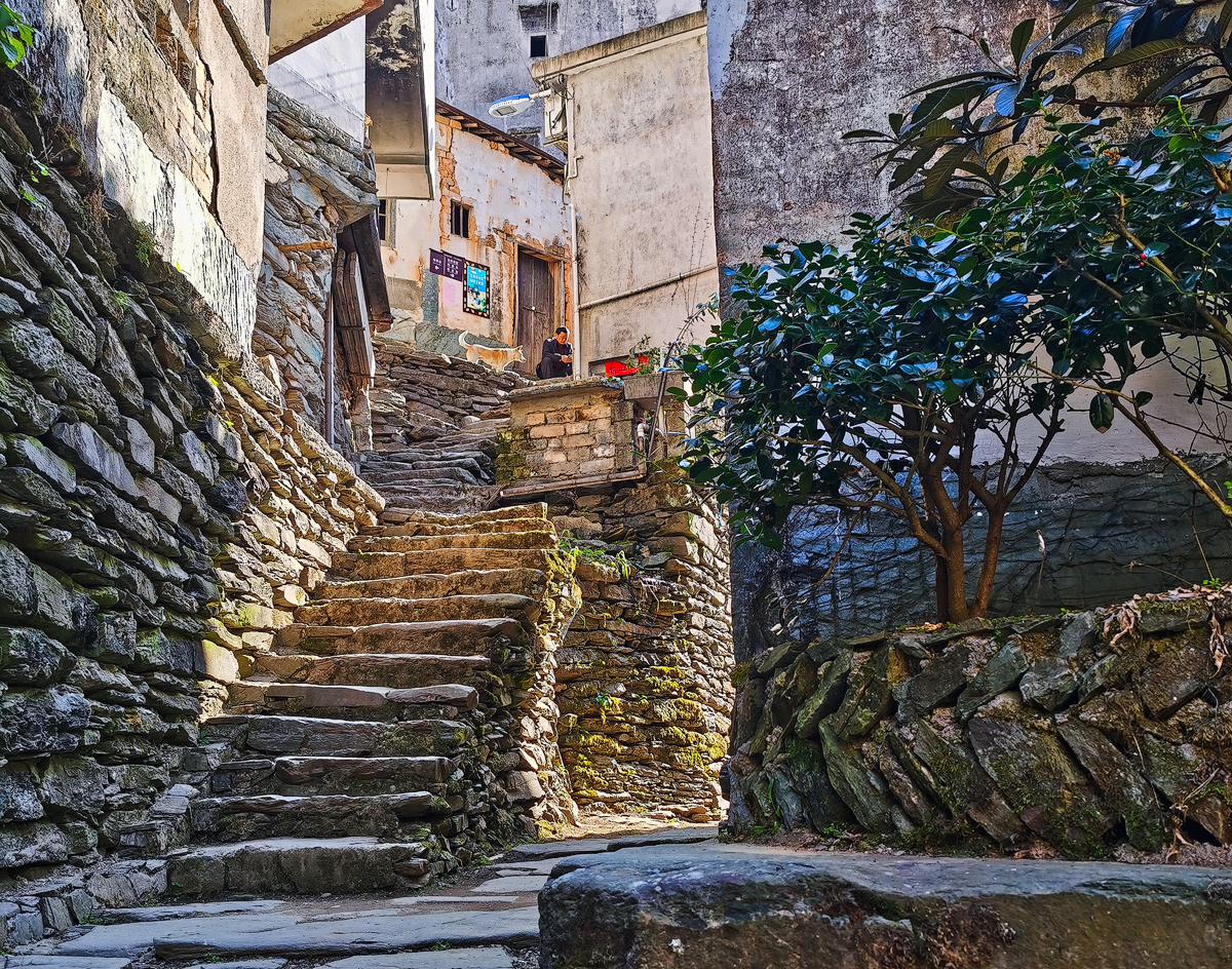 万二村地处歙县昌溪乡西南部半山腰,是远近闻名的石头村,村庄历史悠久,许多房屋就建在这些石磅之上,村中随处可见青石街道,石阶逶迤,巧妙地连通村庄的每个角落。