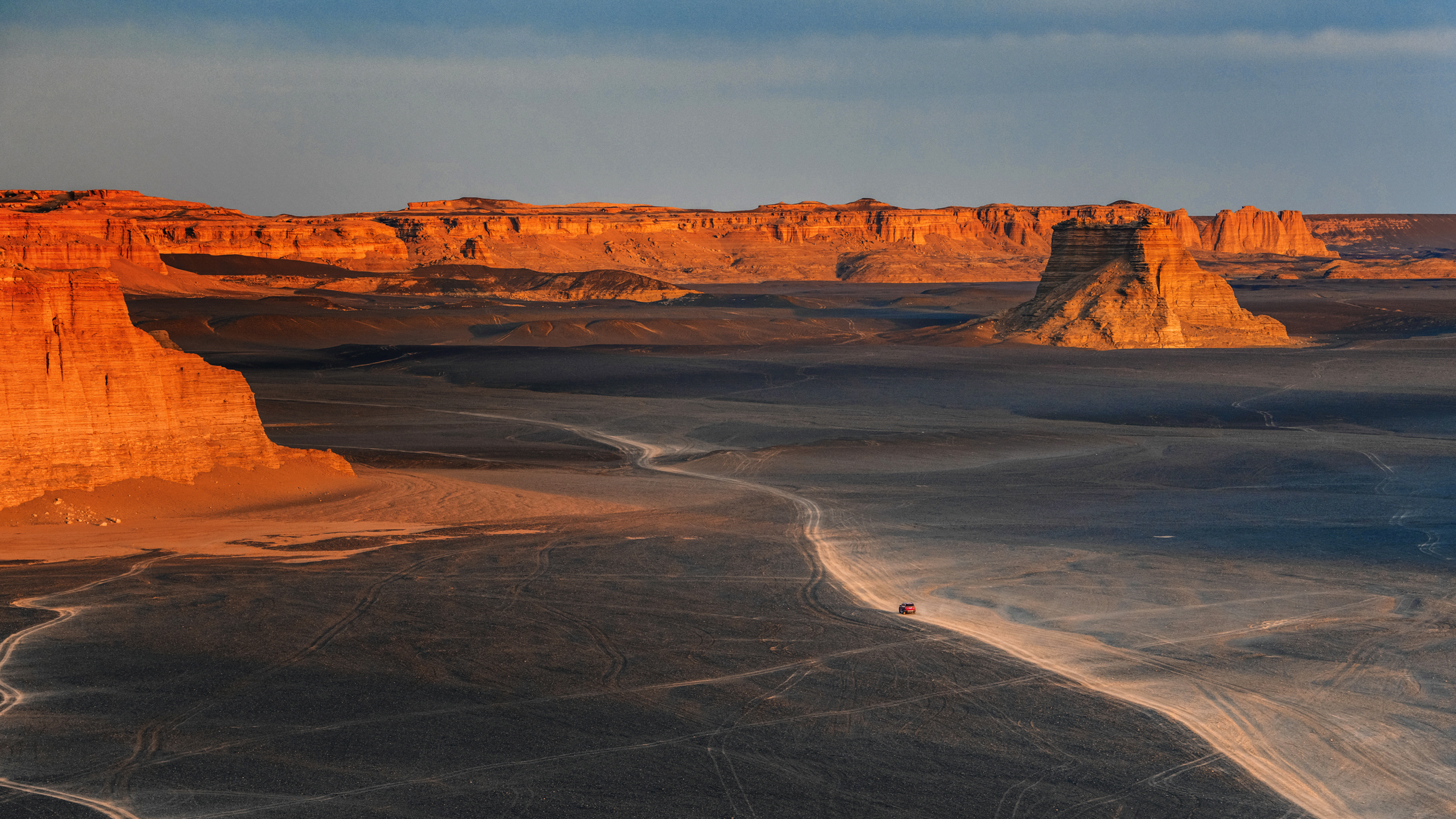 镜头里的大海道,圆了我来之前对罗布泊的一切幻想。广漠、空旷、无垠,似茫茫海底,又像电影中无垠的外太空星球....数千座柱状、锥状、城堡状的断崖景观犬牙交错。夕阳下,这些形态各异的大家伙呈现出夺目的赤红。夕阳的辉光把这些断崖塑造成一座座金灿灿的奖杯。这里的雅丹比之前在俄博梁看到的更高大,更鬼魅,更气势磅礴