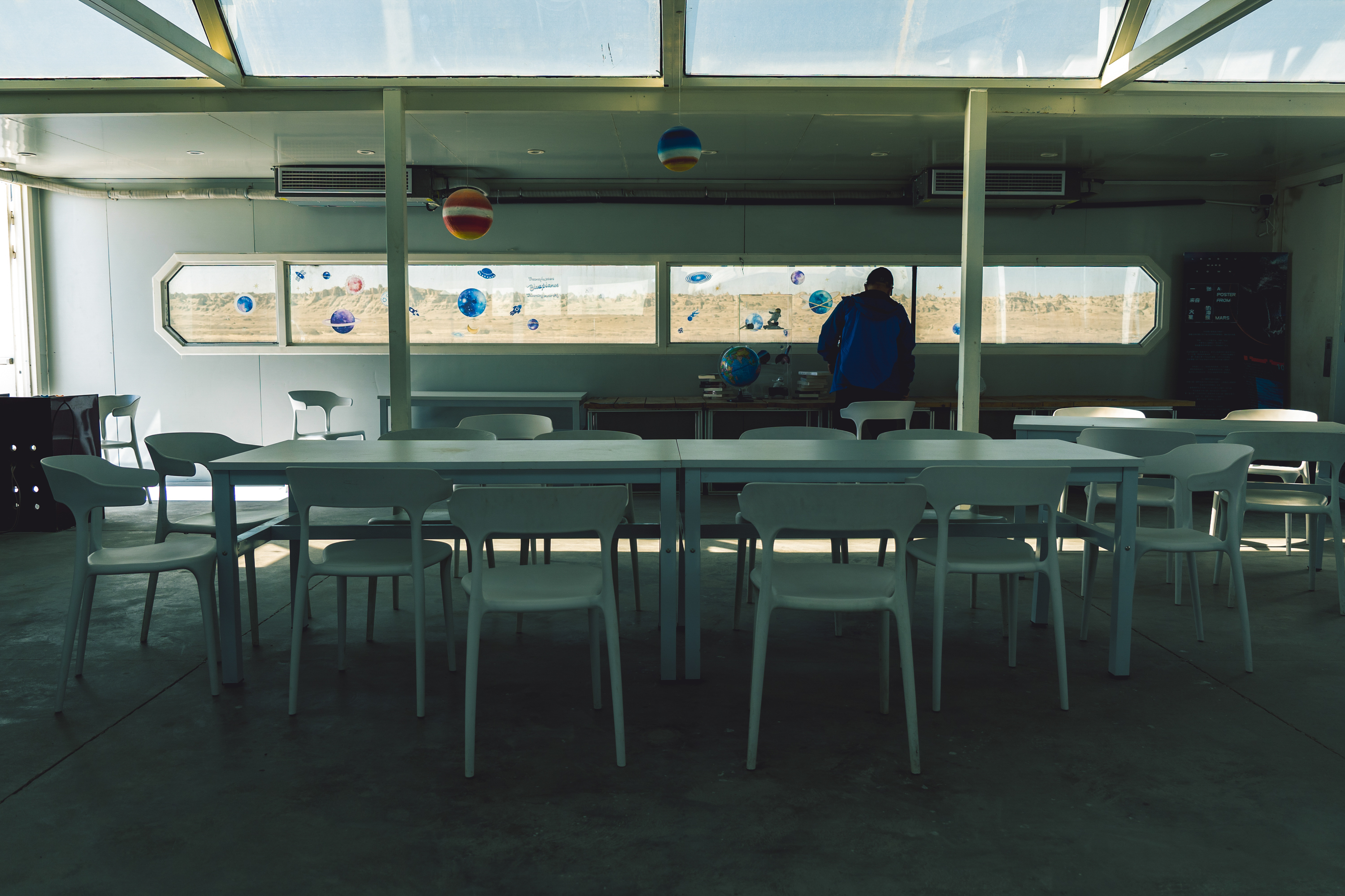 继续沿G315国道行驶,看到“俄博梁雅丹地址公园”后进入火星1号公路,大概再行进30公里左右便抵达火星营地,从石油小镇开过来已是下午一点多。营地远远望去很有科技感,像是真的到了电影中人类在外星球兴建的基地。但其实这里是一个仿太空舱建造以体验住宿为主的营地,包含了教育科普和旅行住宿两大功效。