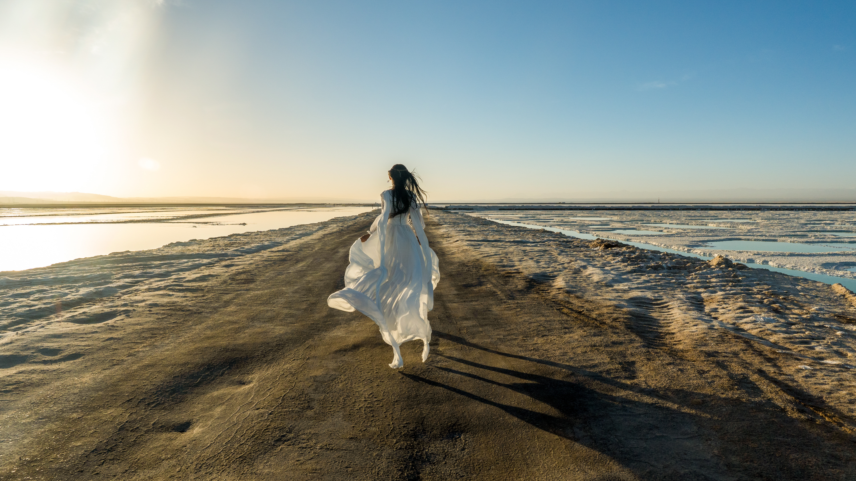 日出的翡翠湖美不胜收,航拍了一会赶紧让丫头姐换上白长裙,想象着蓝白相间的美好,可拍起来却感觉差了些意境...回头翻看照片对比,上帝视角让湖面在光线的折射下显得无比纯净,层次分明,而地面平拍却只能得到普通色泽和视角