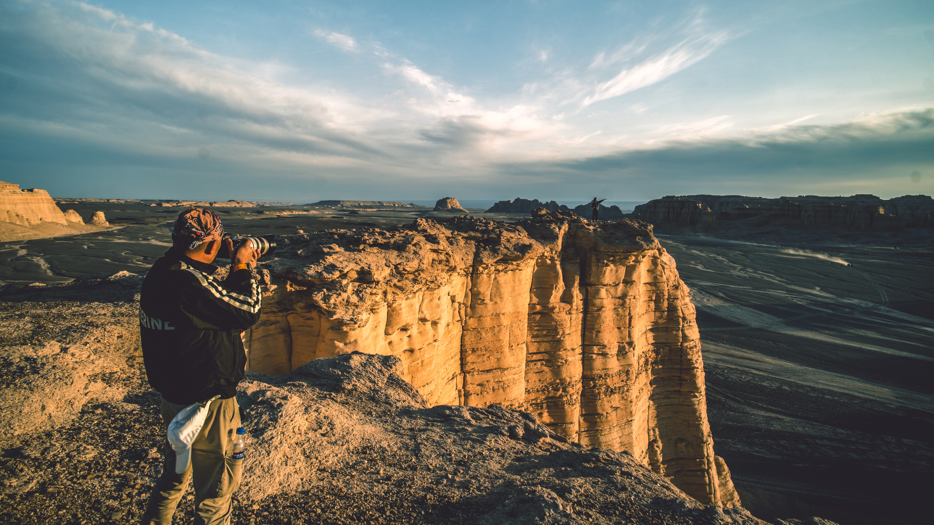 超哥安排好几位师傅生火烧饭等工作,便带着我们要攀爬上最近的一座雅丹,手脚并用大约十来分钟便可到峰顶,峰顶的风力渐渐增大,此情此景不禁让我联想到童年时漫画书七龙珠里场景,孙悟空和贝吉塔一人一个山头,在这片异星球上精彩的打斗,恍惚中彷佛自己就站在他们身边,也能腾云驾雾,来去自由了
