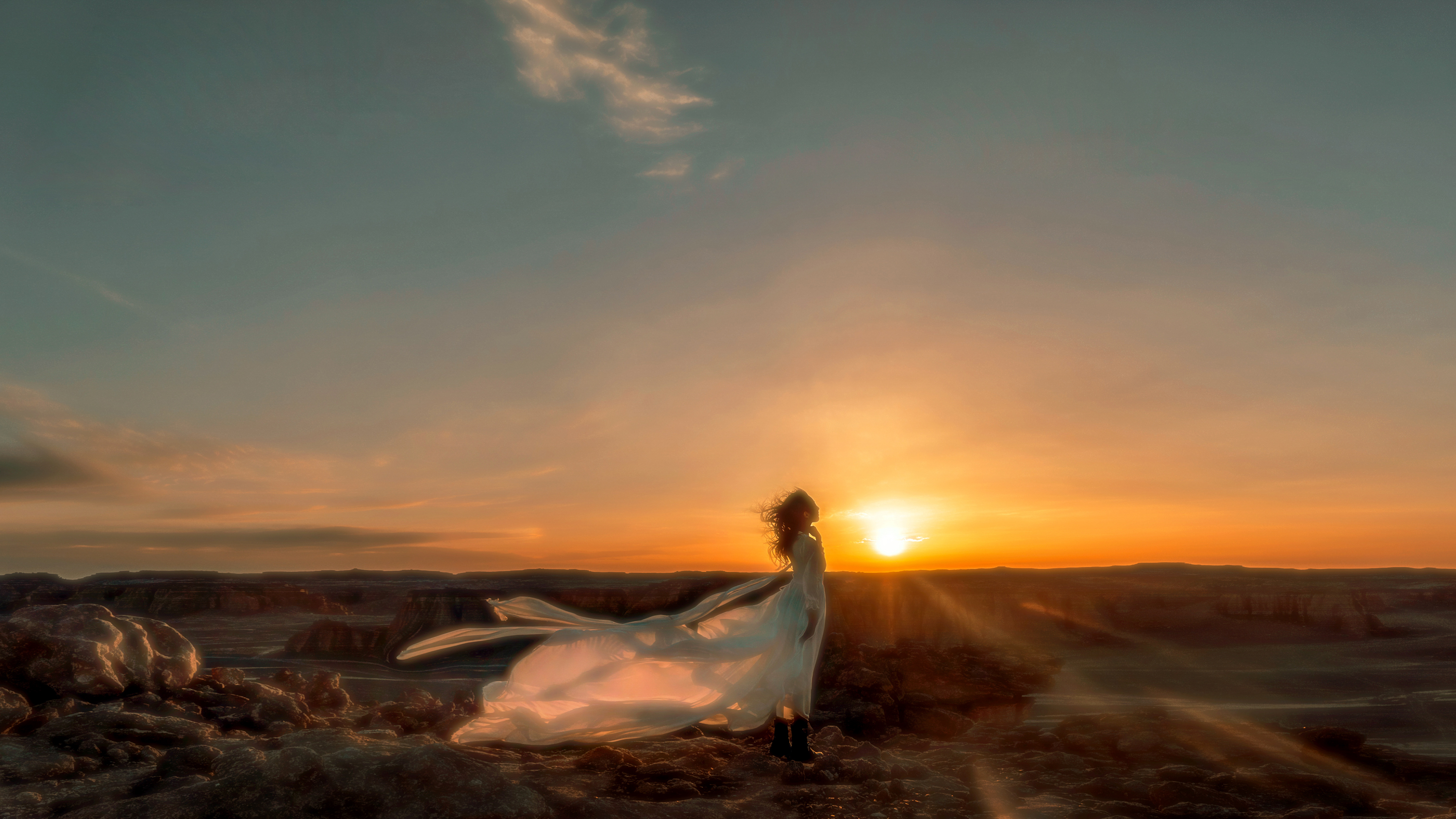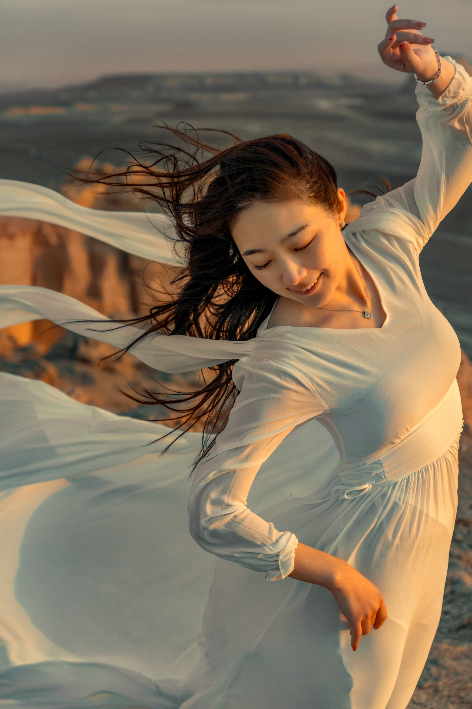 拍好几段延时我马上赶过去,这会儿emma已换好丫头的白长裙,正迎着日落翩翩起舞,强烈的逆光穿透黑发,穿透白纱,给整个人镶上一层金黄色的轮廓