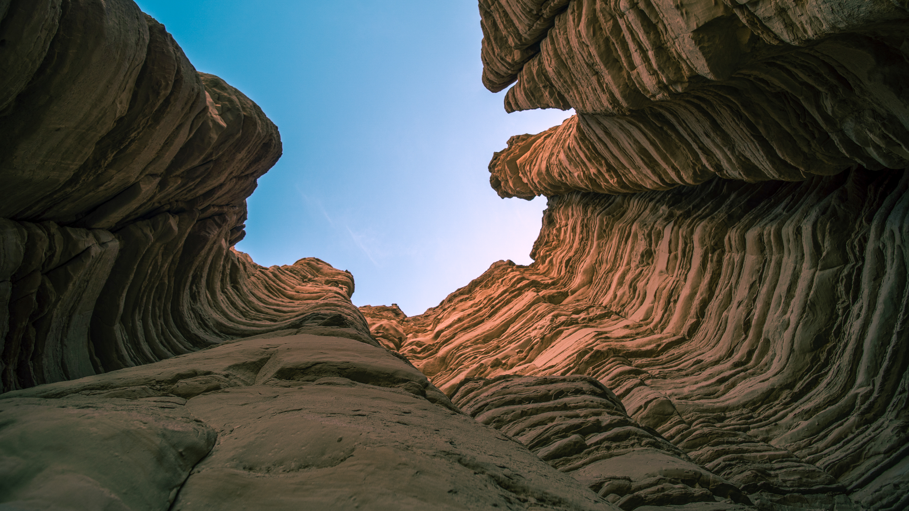 天气晴好,无风少云,整个峡谷寂静无声只有我们几个人参观前行,强烈的阳光把高耸的悬壁照耀的棱角分明。置身于红褐色山体之间的光影斑驳之中,令人充满遐想。天空如一块蓝色的幕布,与峡谷构成了一幅唯美的极简画面。