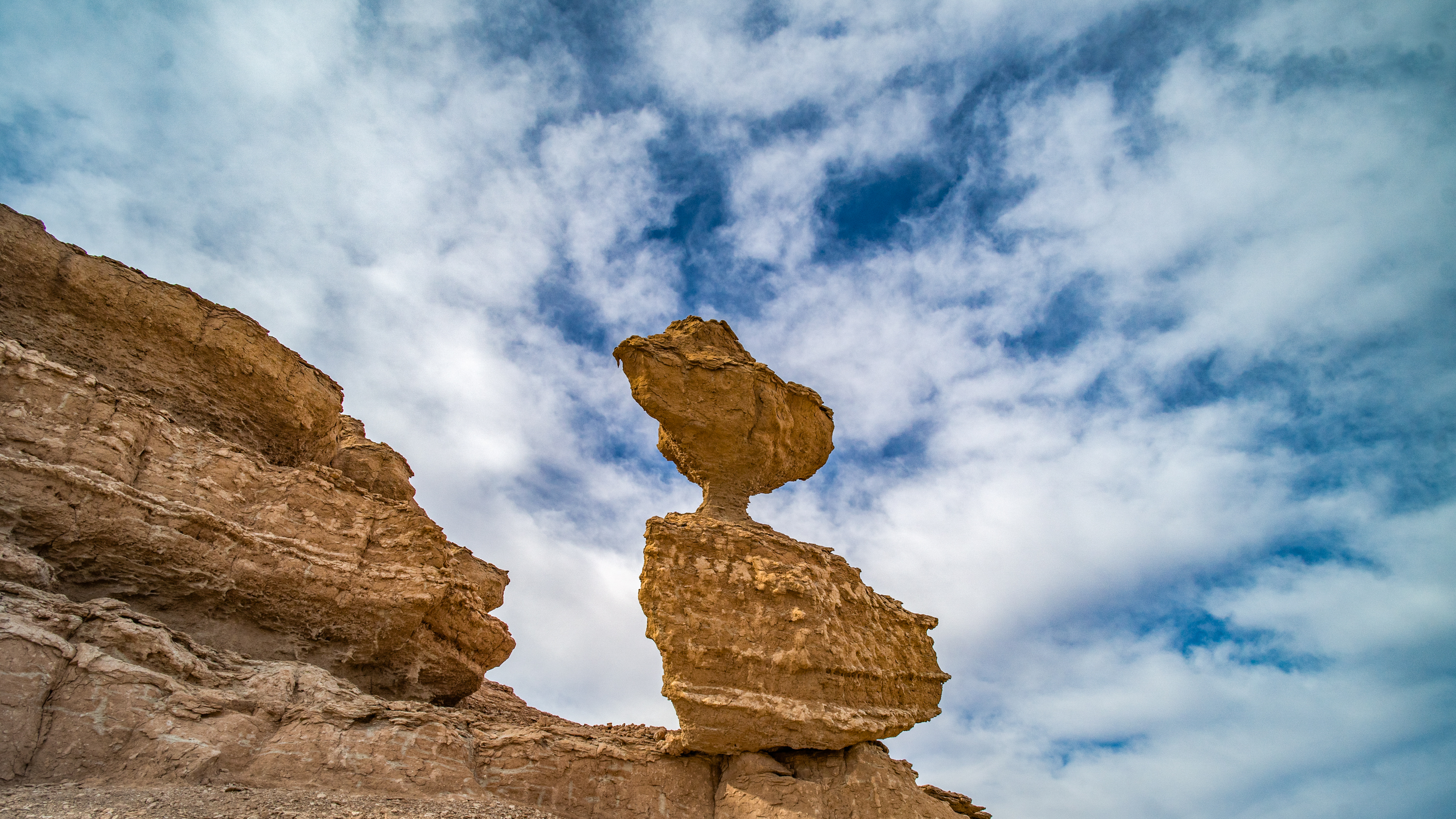 吃过早饭,趁着师傅们收拾帐篷的时间超哥神秘兮兮的说带大家去附近一处隐秘景点参观,转过几个雅丹,两处一大一小高耸直插天际的坑洞赫然出现在眼前