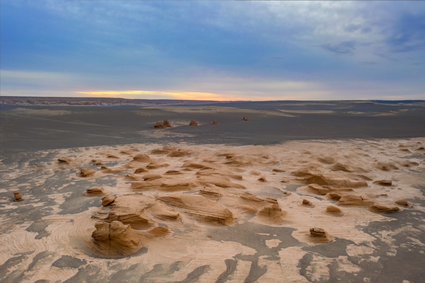 五点左右车队顺利抵达了大海道,虽说已是十月日落时间会比夏天提前不少,好再这里一马平川直到晚上七点多太阳还没完全落下。小伙伴们迫不及待的飞起了无人机,一瞬间五架无人机同时升空,大家打好招呼互相通报了各自的飞行高度,以避免空中撞机。当无人机升到200米高空做360度环绕观察时,手机画面中的景象彻底把我征服了。