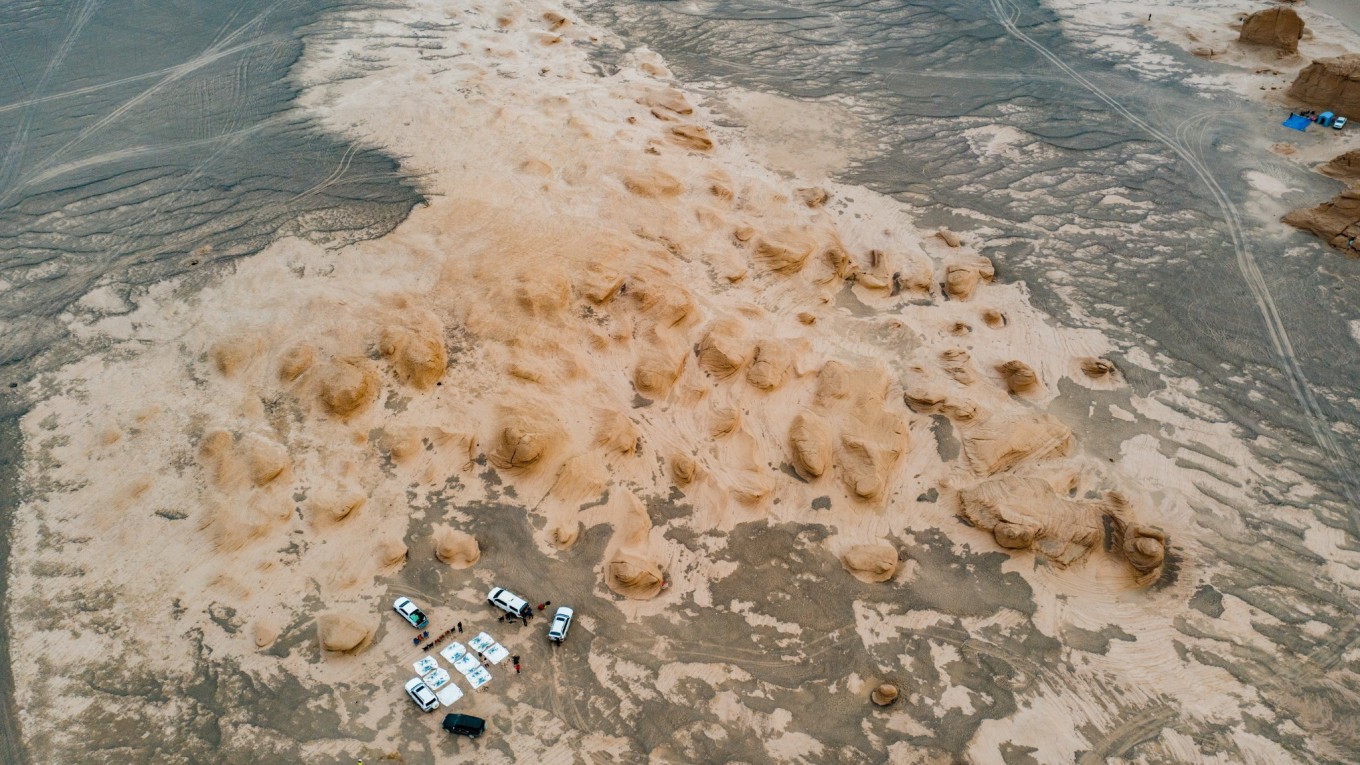 小憩后车队继续向深处行驶,前往第一晚的扎营地:白龙堆。随着向更深处的行进,渐渐四周景观开始变得壮观起来。成群的形状各异的土坡似远洋舰队又像一条条巨龙从车窗外向身后划过,超哥告诉我们这里就是典型的雅丹地貌了,我们今晚会在这附件扎营休息。赶在日落前我们把无人机飞到能抵达的最高处,无人不为之震撼!