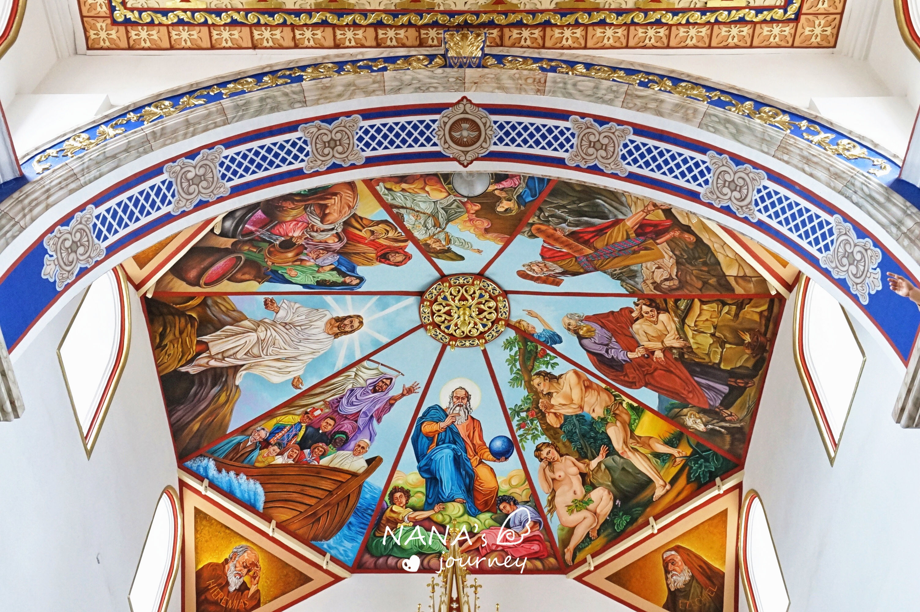 而简洁的外表之内,依旧是豪华的内饰,不过这个教堂还真是略带可爱的蕾丝花纹装饰在墙上,连画框的装饰也是金子做的。