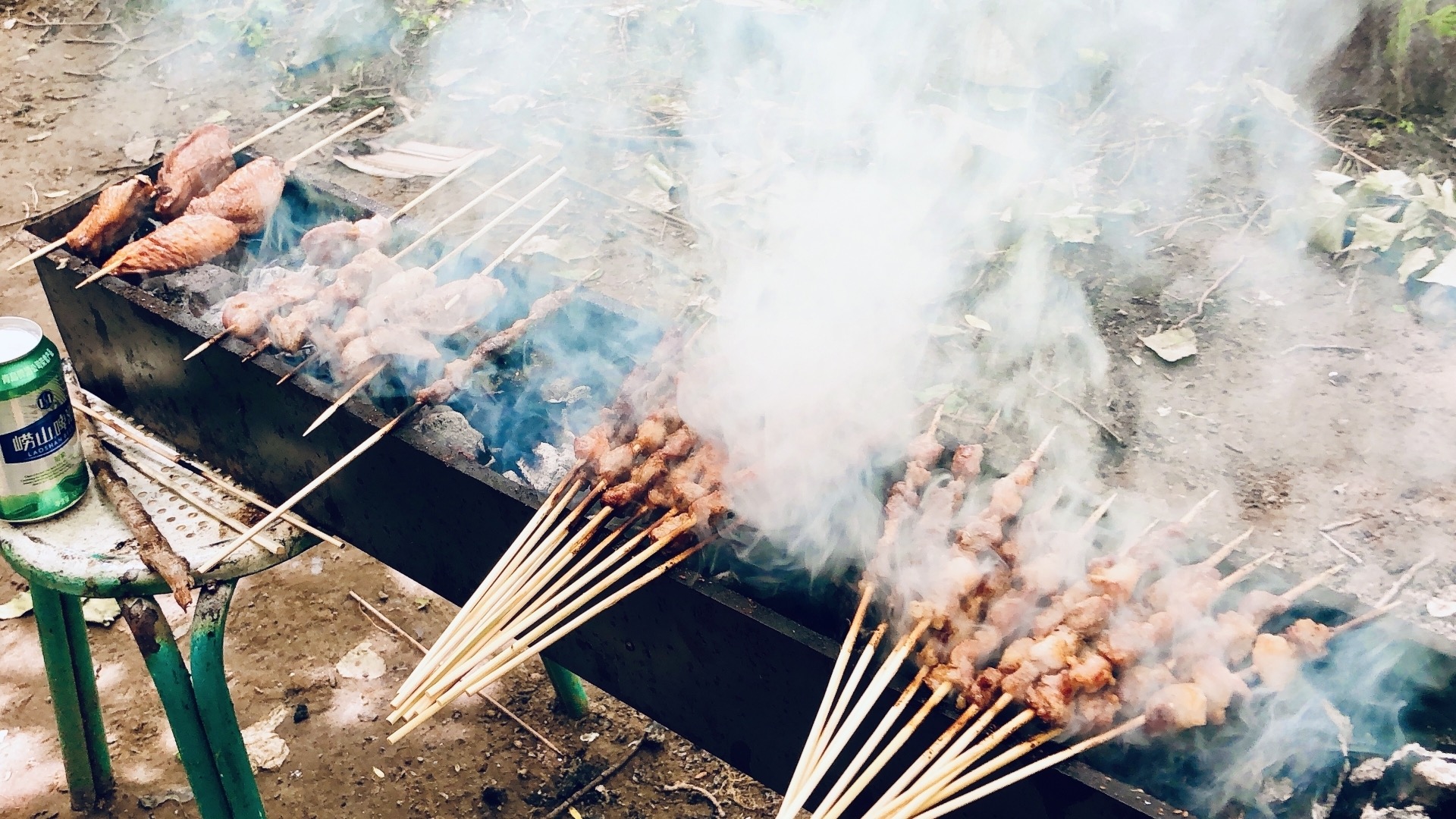 看到吃的立马效率高起来了,女生洗菜穿串,男生搬烤炉,生火,一切发生的就是那么自然~