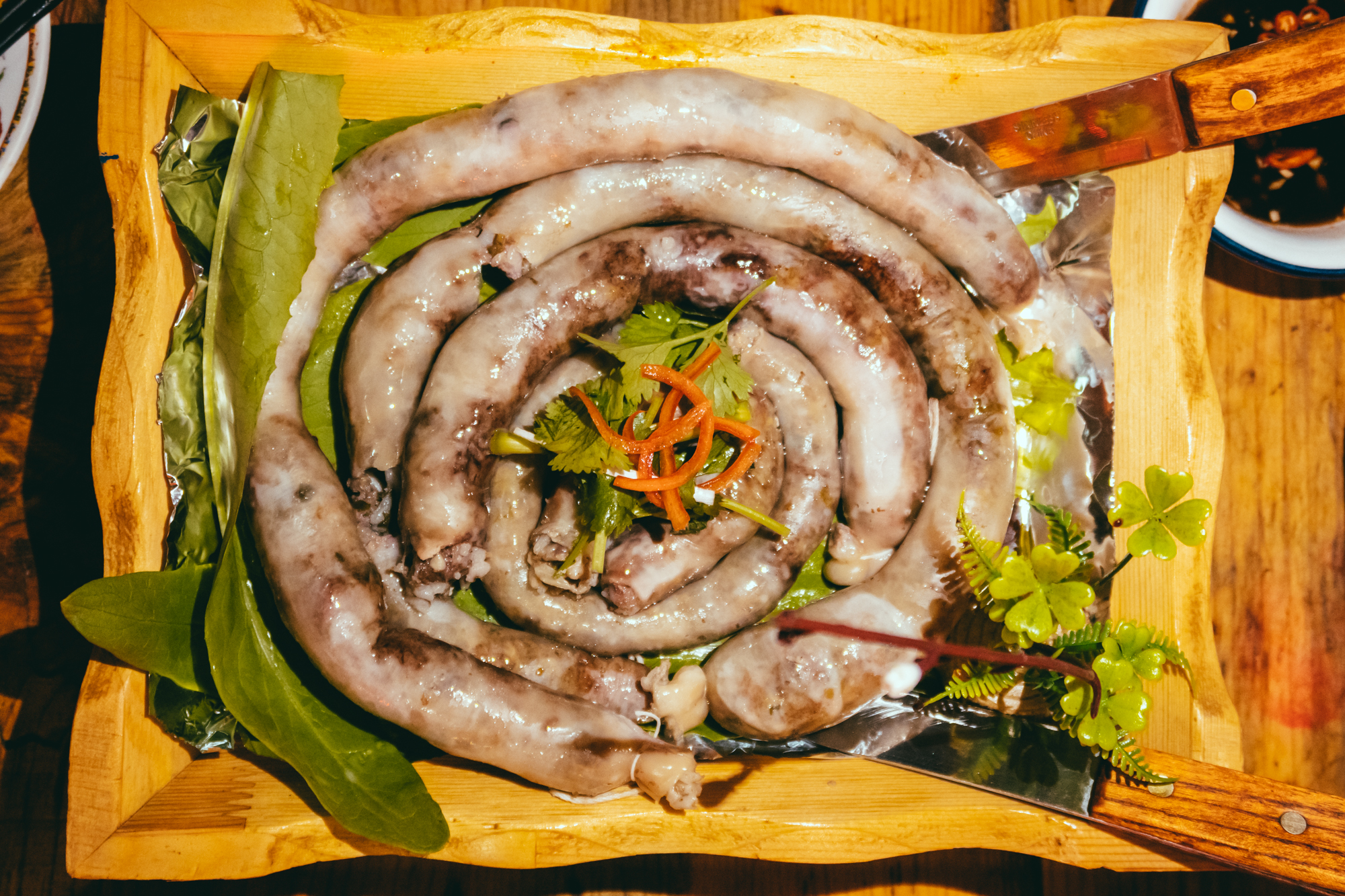 肉肠是我极喜欢的一道菜肴。青菜叶铺在盘底,上面摆上一段段闻起来香、吃起来更香的肉肠,上面再撒上几片香菜,真的是让人欲罢不能啊。