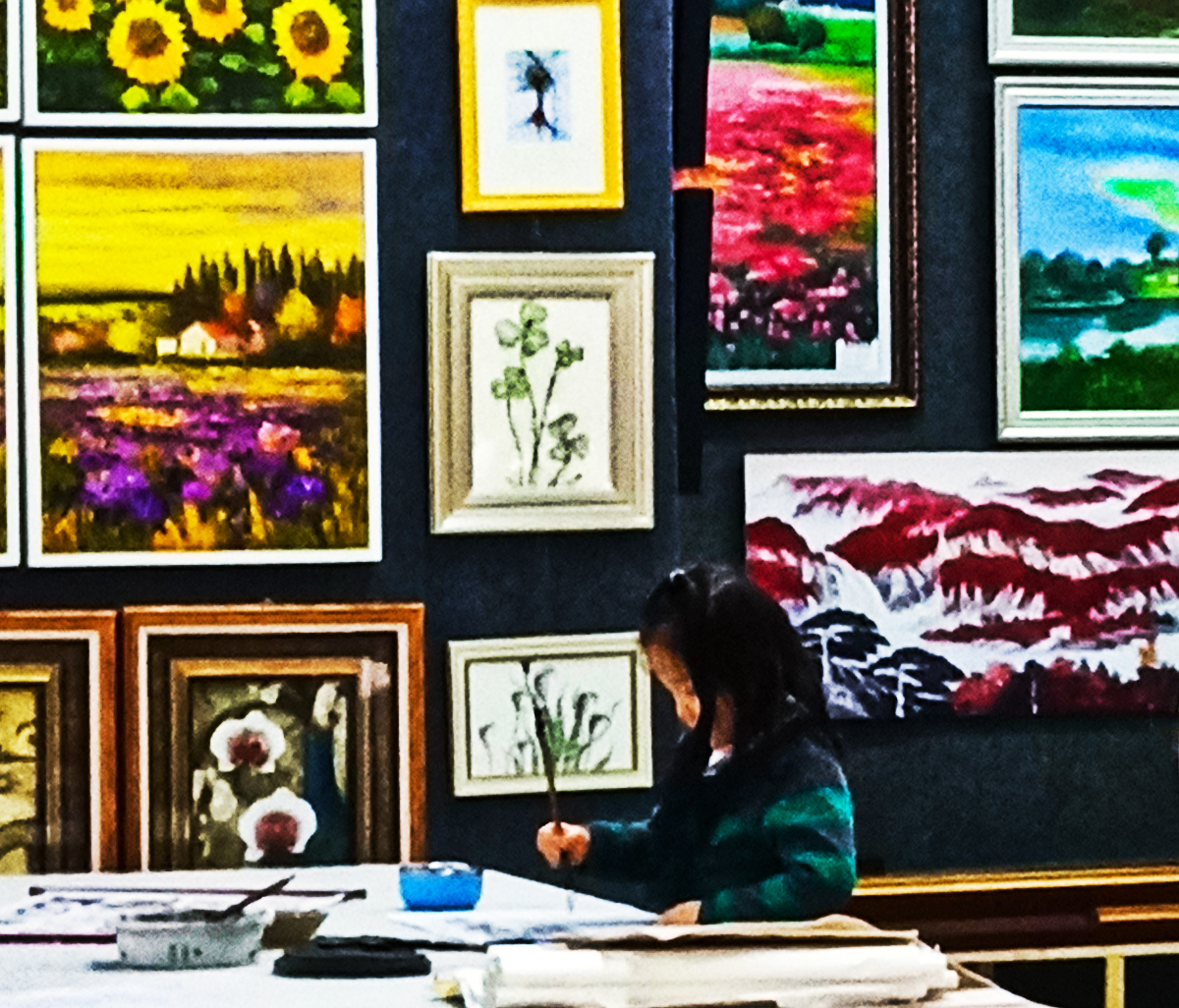 喜欢观赏店铺里这些画作:画工精致、色彩搭配非常棒的一幅幅画,被随意摆放在了店里的不同角落,仔细观看,风景人物,皆令人赞叹。