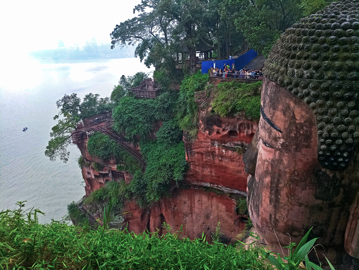 沿着右边九曲栈道向下走,这座开凿于唐朝的栈道非常陡峭,游客通过往往人挤人,爬行非常缓慢。站在大佛的脚下,正面去抬眼拜谒大佛,才能真正感觉到大佛的大格外惊心,仿佛高过了山头,直入云霄,高大庄严,显得自己是如此渺小;游客也可以乘船远观江面上的大佛全景。大佛实在太壮观了,真是一个奇迹!