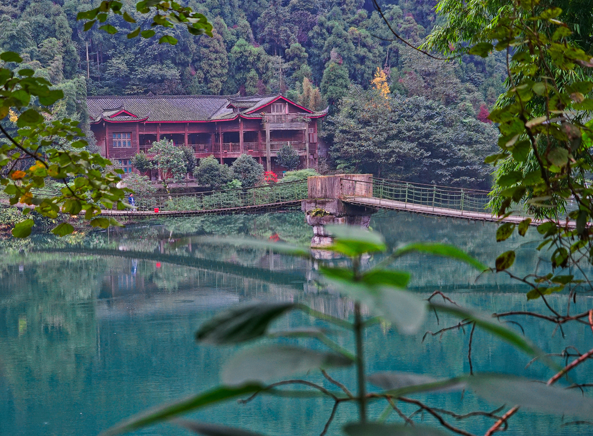 这里是峨眉山传统十景之一的“双桥清音” 。清音阁地处峨眉山上下山的中枢,与 龙门 洞素称“水胜双绝”。清音阁对面,展示着一幅青绿山水画卷,浓绿重彩,精工点染。看---牛心亭两侧各有一石桥,分跨在黑白二水之上,形如双翼,故名双飞桥。