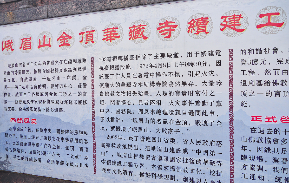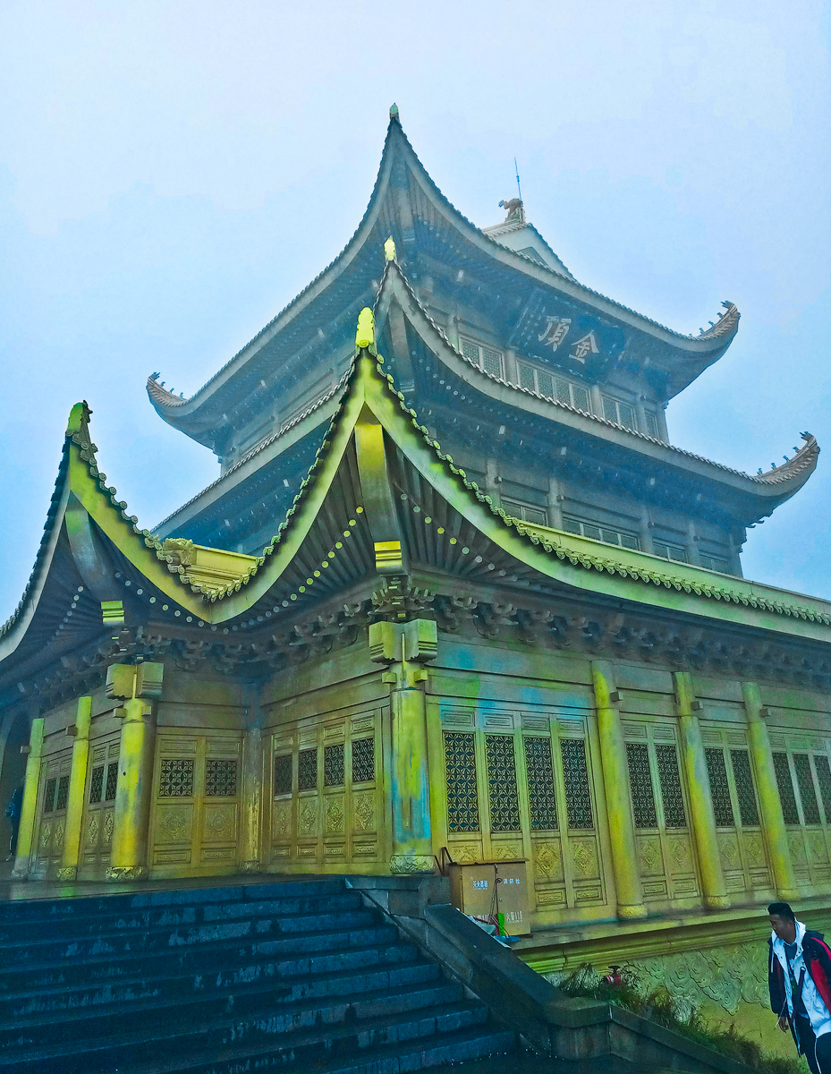 海拔3079米的金顶是峨眉山自然风光精华所在地和 中国 汉传佛教海拔最高的朝圣中心。早在明代,以金顶、银顶、宝顶三顶为主体的峨眉山华藏寺寺院建筑群格局便已开启。进入21世纪以来,峨眉山实施金顶综合整治提升工程,第一期建成金顶金殿、大雄宝殿,银顶卧云禅院及十方普贤圣像,第二期便是历时5年恢复重建华藏寺宝顶观音殿工程。为奇秀峨眉山再添胜景。