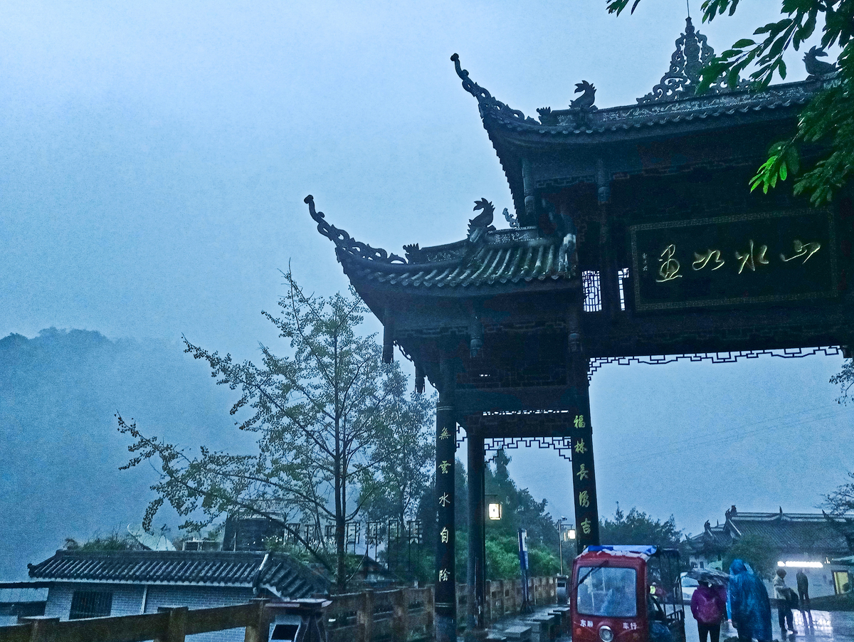 下雨路滑,些许峨眉山滑竿的人力车夫在这里等生意。