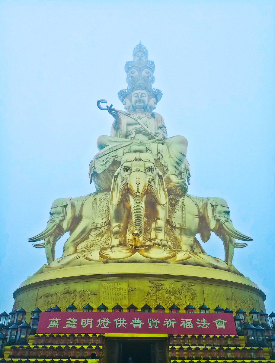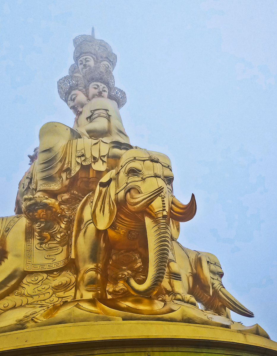 十方普贤金像位于峨眉山金顶,于2006年6月18日落成 ,圣像为铜质,通高48米,重达600多吨,建筑面积1000㎡,是世界上最大、最高的十方普贤像。圣像正面手持如意,骑六牙圣象;大象背上第一层为普贤 菩萨 的四头像和两面身;第二层为普贤 菩萨 四头像;最高层为前后普贤 菩萨 头像。 金光耀眼的普贤像会毫无悬念的震慑每个游客,产生一种由心而生的敬畏。