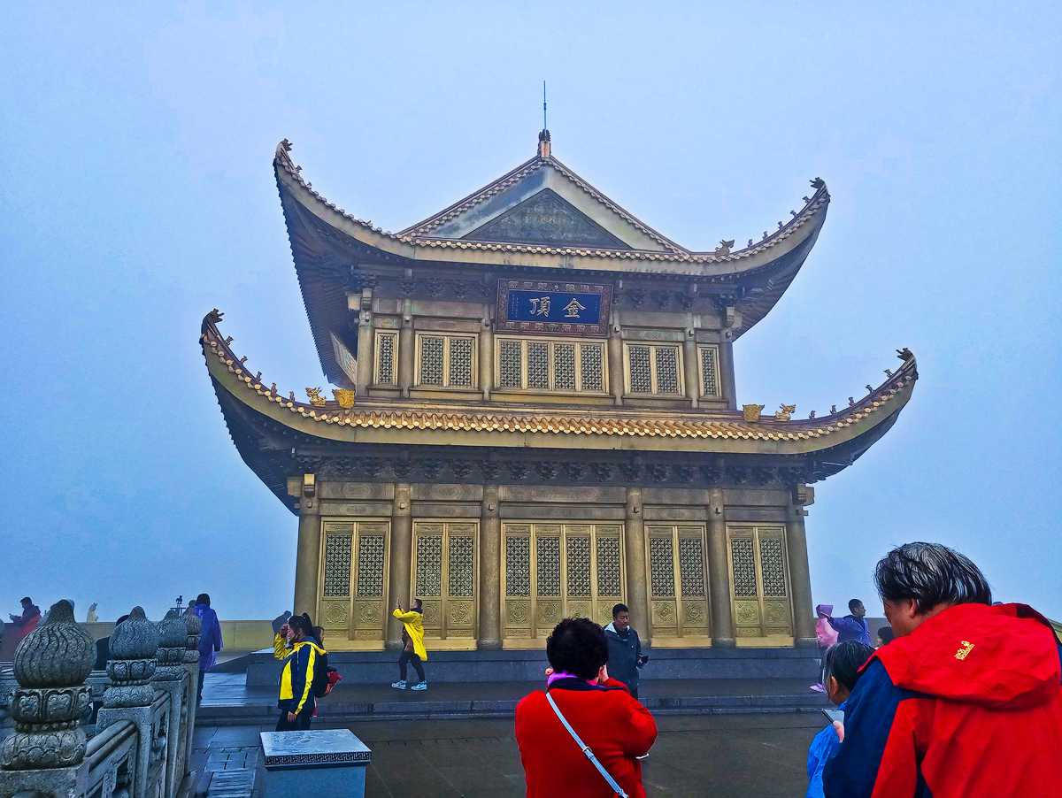 我们终于来到峨眉山金顶的位置,虽然天还在下雨,看不到日出,但瞬间一个巨大的金佛映入我们眼帘-----十方普贤圣像,它是世界上最高的金佛,以及峨眉山的镇山之宝——重62吨的普贤骑象。站在金佛前,感觉自己是多么渺小,雾大近处还能看清楚,远处雾蒙蒙,游客们都沉浸在蒙蒙雾中。