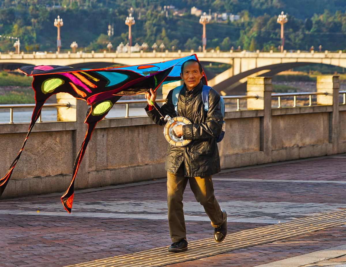美丽的风筝再蓝天上飞翔,放风筝的是一位老汉。