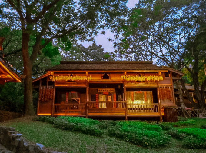 民俗村的夜景也不错。华灯初上,风雨桥就变成了夜色与薄雾中的风景,伫立远眺,恍然间,千里之外就在咫尺间。傍晚时分,别忘了登上塔顶,眺望整个民俗村,这个时刻,地球都渺小了,因为世界就在挥手间。