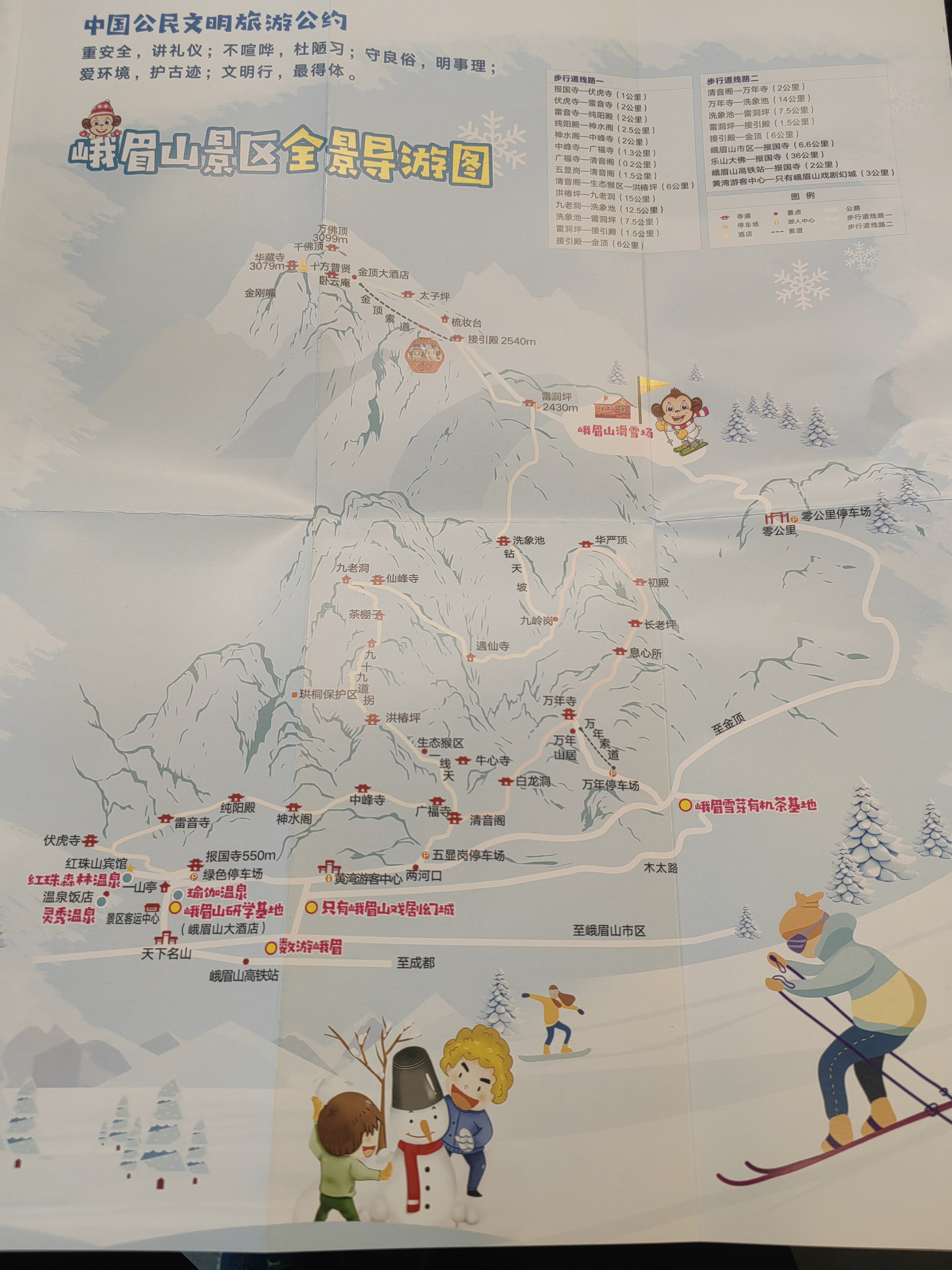 下午:金顶-万年寺停车场,换乘万年索道到万年寺吃素斋或万年索道上站口左边万年雪芽坊用餐。参观万年三宝(佛牙、贝叶经、万历金印),朝拜普贤铜像,参观万年特色弹琴蛙、神奇的无梁砖殿;徒步到万年停车场坐车返回黄湾车站/报国寺车站/峨眉山高铁站返回。