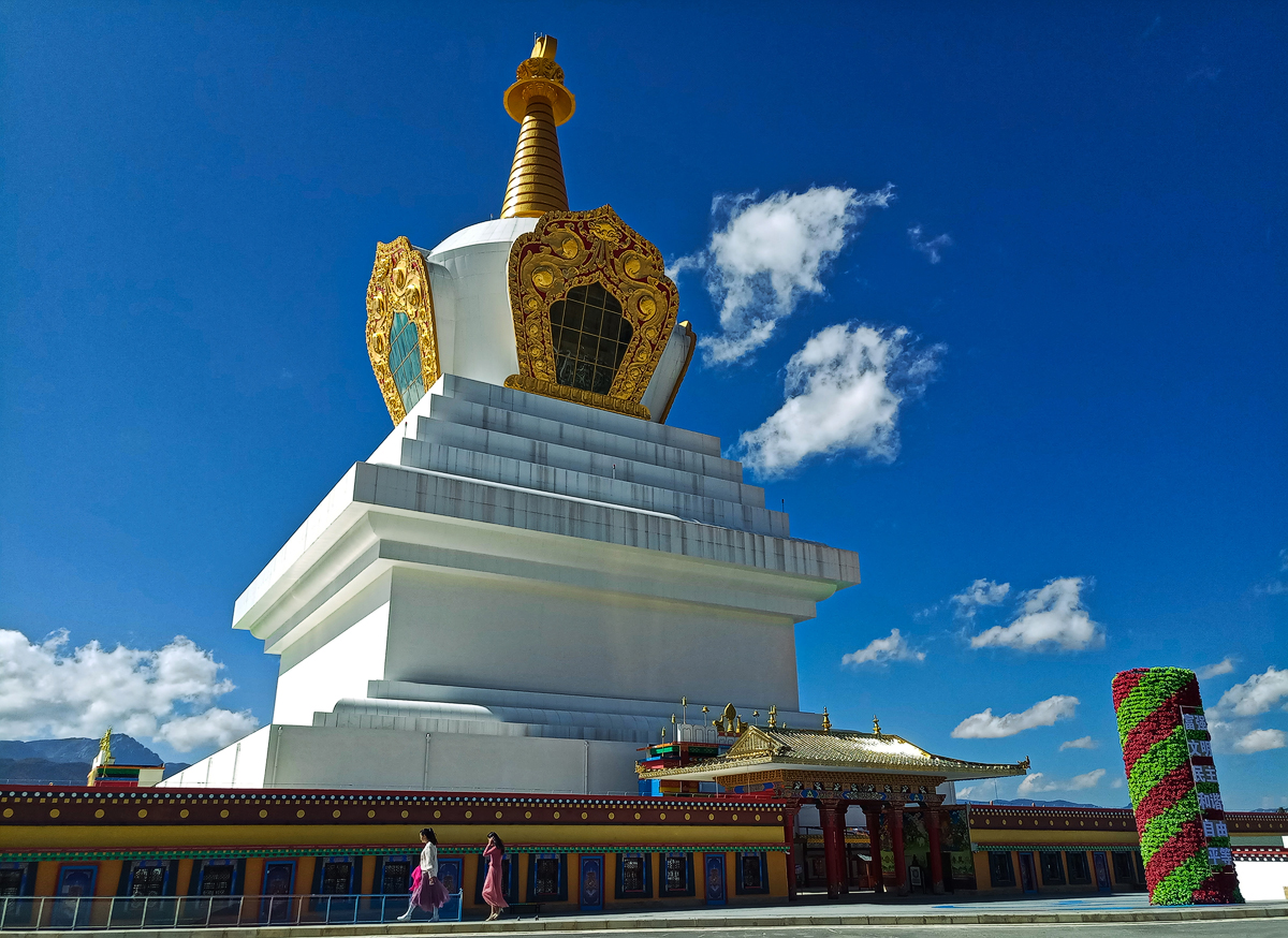 “ 香格里拉 和谐塔中塔”,又称大白塔,是按藏传佛教塔中塔方式构建。即塔外有塔,塔在塔中。白塔缘起于古代 印度 ,塔的功能最早是用来供奉或收藏佛舍利(佛骨)、佛像、佛经、僧人遗体等的高耸型点式建筑,所以又称“佛塔”。佛塔四方佛龛供奉有四臂观音、文殊 菩萨 、莲花生大师、宗喀巴大师塑像各一尊。
