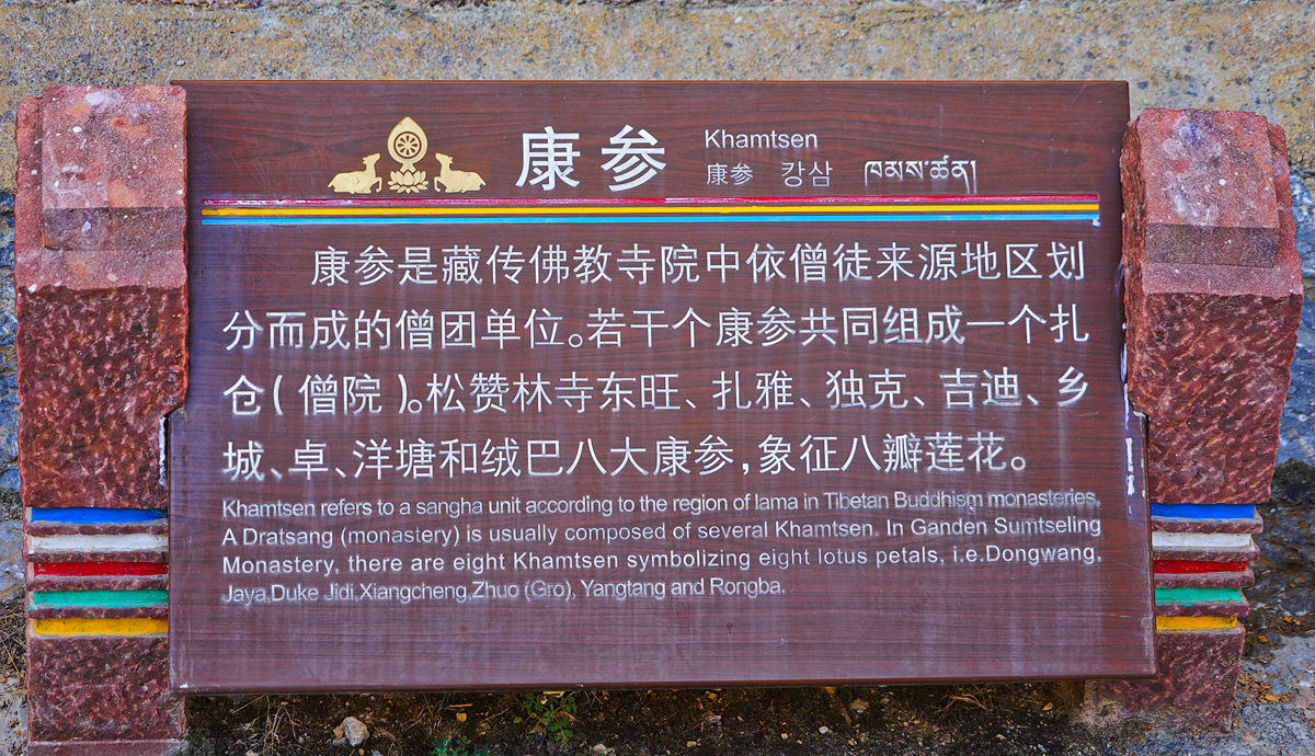 “康参”,藏语意为僧团,即按僧侣籍贯或来源地的地域划分,将大寺僧侣划分形成教区区域性组织。康参由老僧主持,下设念哇、格干等办事人员,相对独立地管理教区的行政、宗教、经济事务。松赞林寺的八大康参为:独克、扎雅、东旺、绒巴、洋朵、结底、卓、 乡城 康参。象征着八瓣莲花。