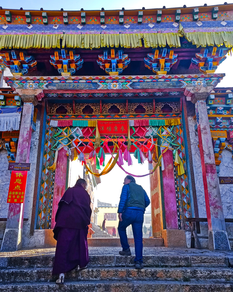 噶丹松赞林寺,距 香格里拉 县城5公里。属省级重点文物保护单位。作为 云南 藏族佛教最大的名寺,全寺占地500亩,筑有坚固、厚实的城恒。开设扎雅、独克、东旺、龙巴、鲁古五道城门。扎仓、吉康两大主寺建于最高点,居全寺中央。大寺坐北向南,为五层藏式雕楼建筑。可容1600人跌坐念经。我们进入松赞林寺啦。