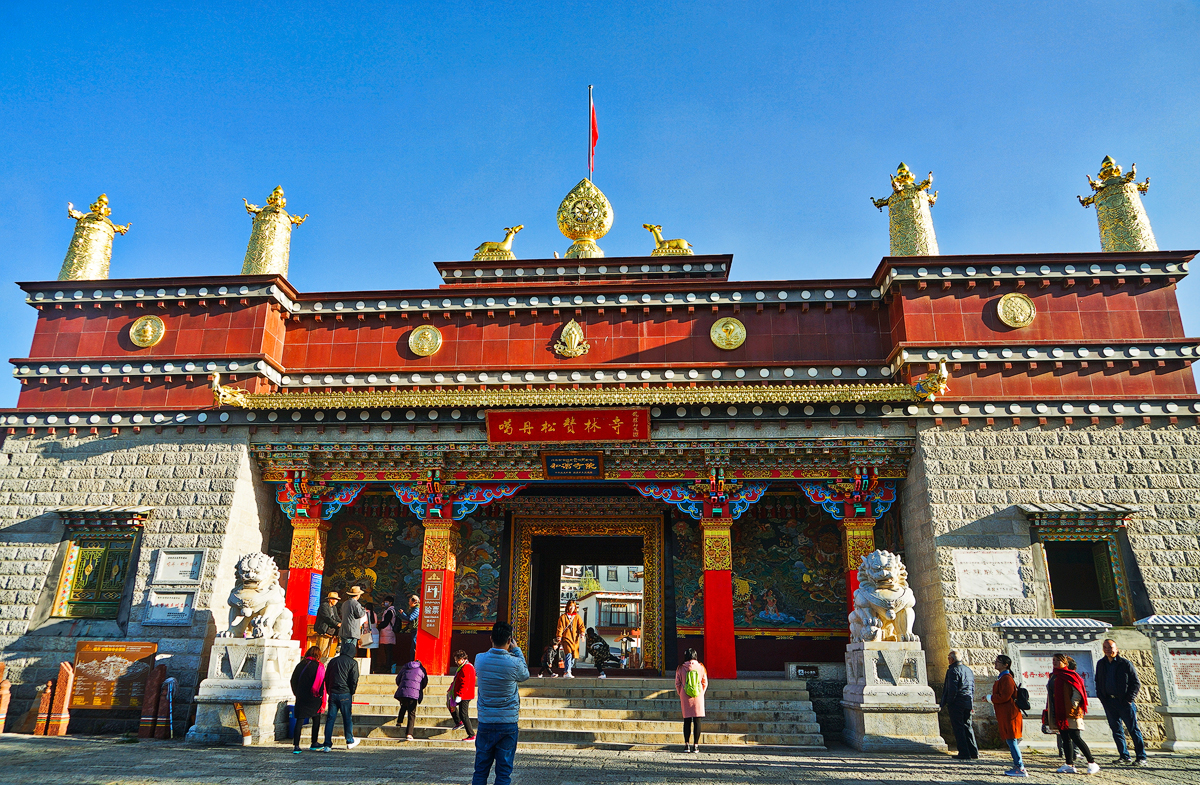 该寺依山而建,外形犹如一座古镇规模的古堡群建筑。五世喇嘛亲赐名“噶丹·松赞林”。集藏族造型艺术之大成,又有“藏族艺术博物馆”之称。