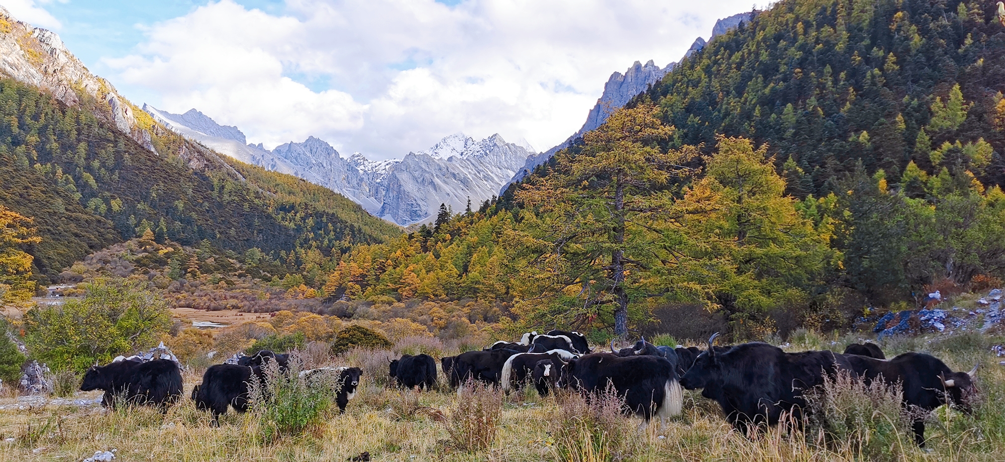 海拔4150米的洛绒牛场被三座雪峰所环绕,是附近村民放牧的高山牧场。 贡嘎河从草场穿梭,林间溪流潺潺。春夏时节草甸上野花盛开,漫山遍野,秋日金黄成片,成群的牛羊在河边和山坡上悠闲的吃草,构成了一幅原始而又迷人的景色,令人遁入返朴归真的境界。