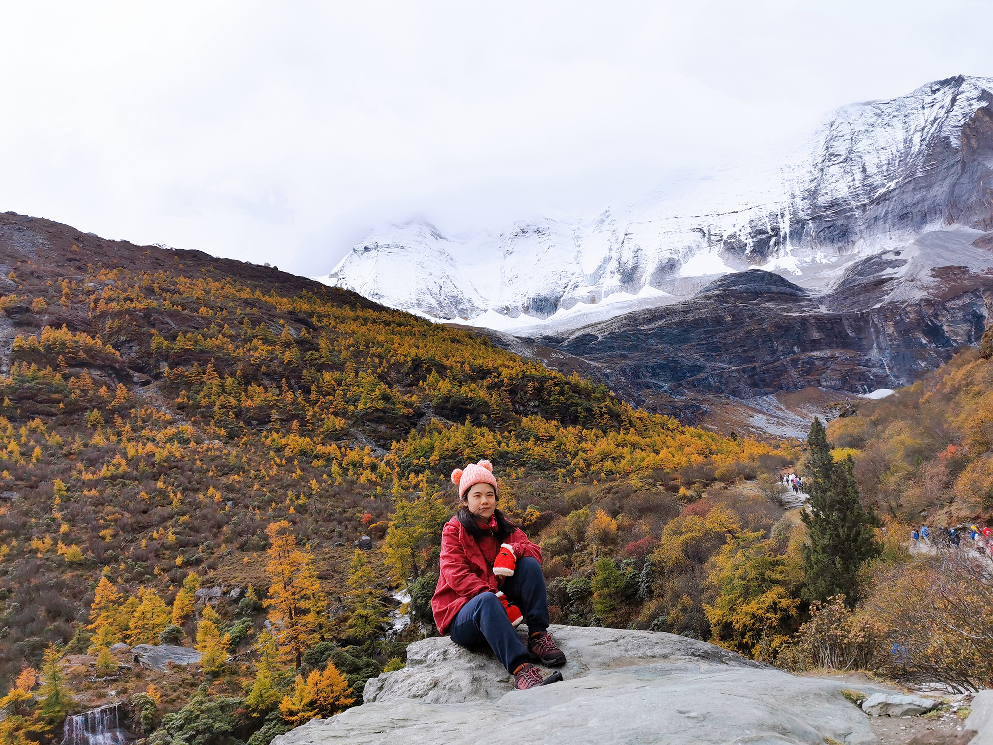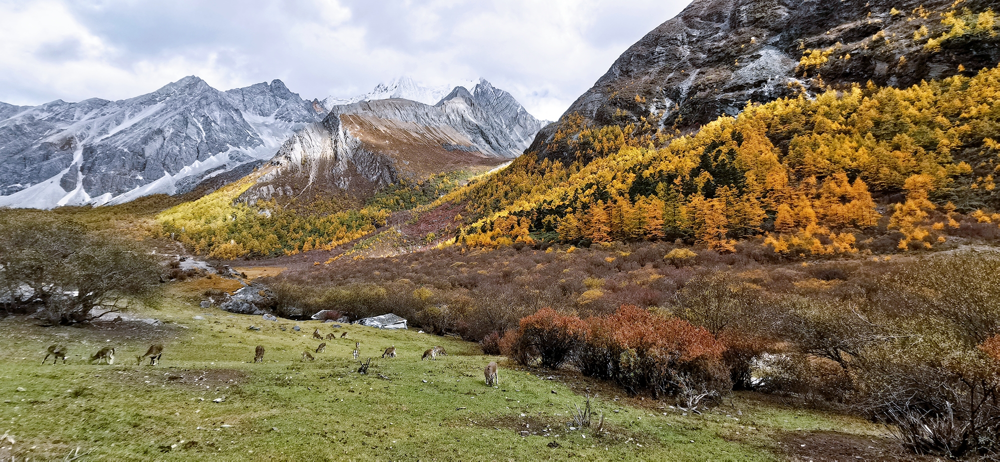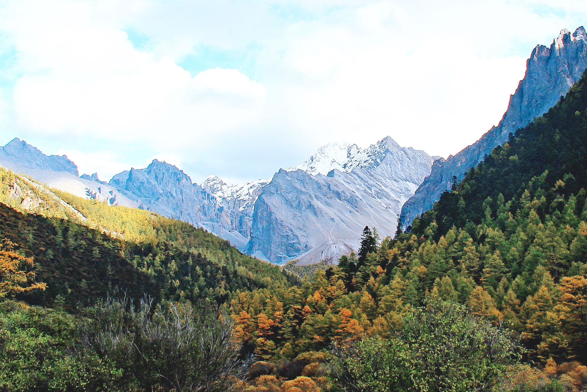 充满生机的绿叶开始变得枯黄,茂盛的枝叶逐渐变得稀疏,秋风中夹杂着微凉的风偶尔伴着点点细雨。印象中的秋天好像是荒凉没有生机的,让人感觉到寂寞孤单,但是亚丁的秋天却有别样的温柔与诗意。