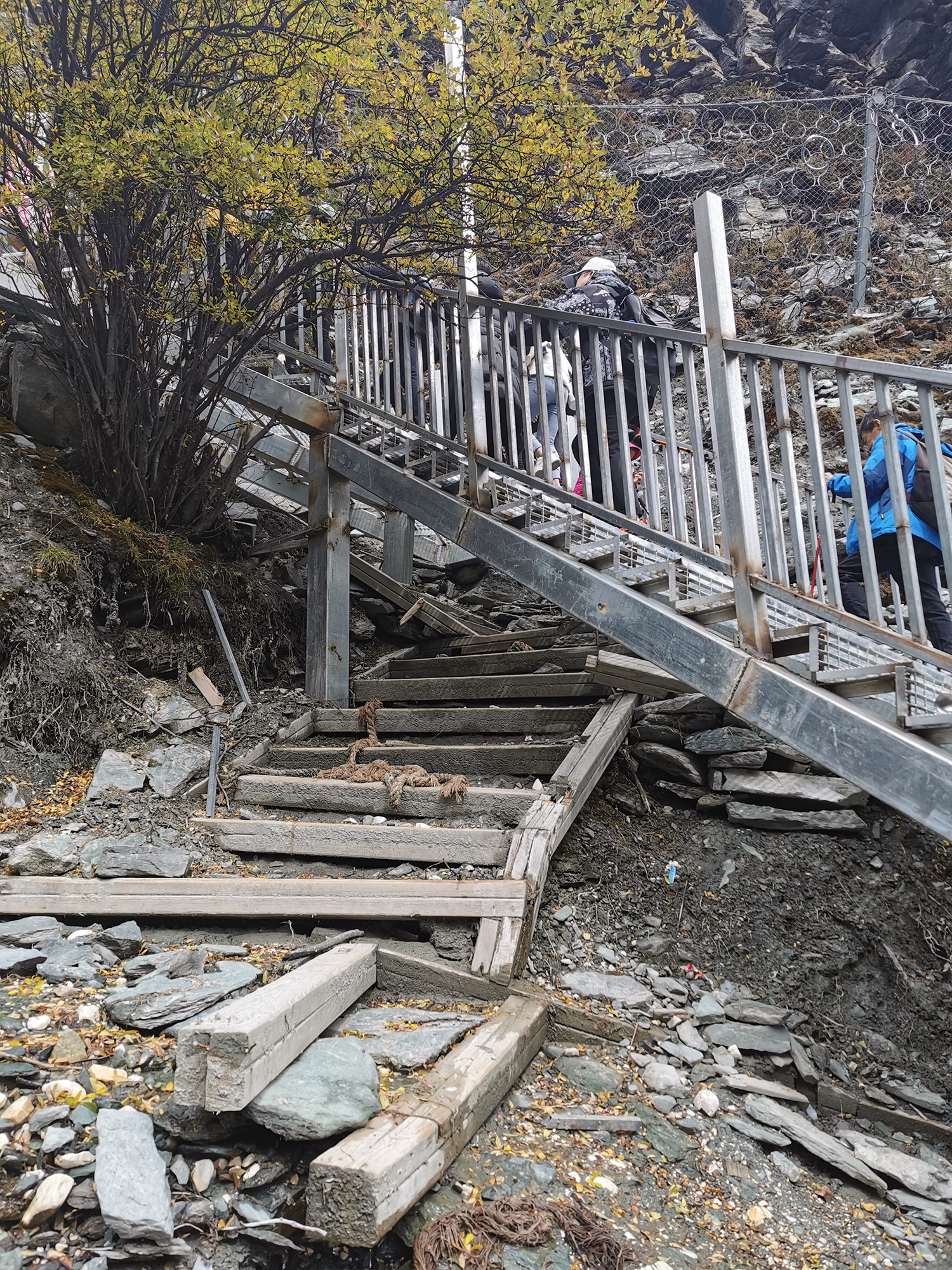 现在徒步路线,几乎仅剩下这一段悬挂着经幡的有着小溪流的土路了,其余的几乎都布满了木栈道,包括那段高高的往五色海方向的陡坡也一样有了新栈道。 对比三年前的木头栈道,长线路上的新栈道已经修好,钢架结构更加结实也更 加平 稳,大大减少了徒步的难度,只是这山林间徒步的野趣也少了许多。这里更适合游客,而 洛克 线更适合徒步爱好者。
