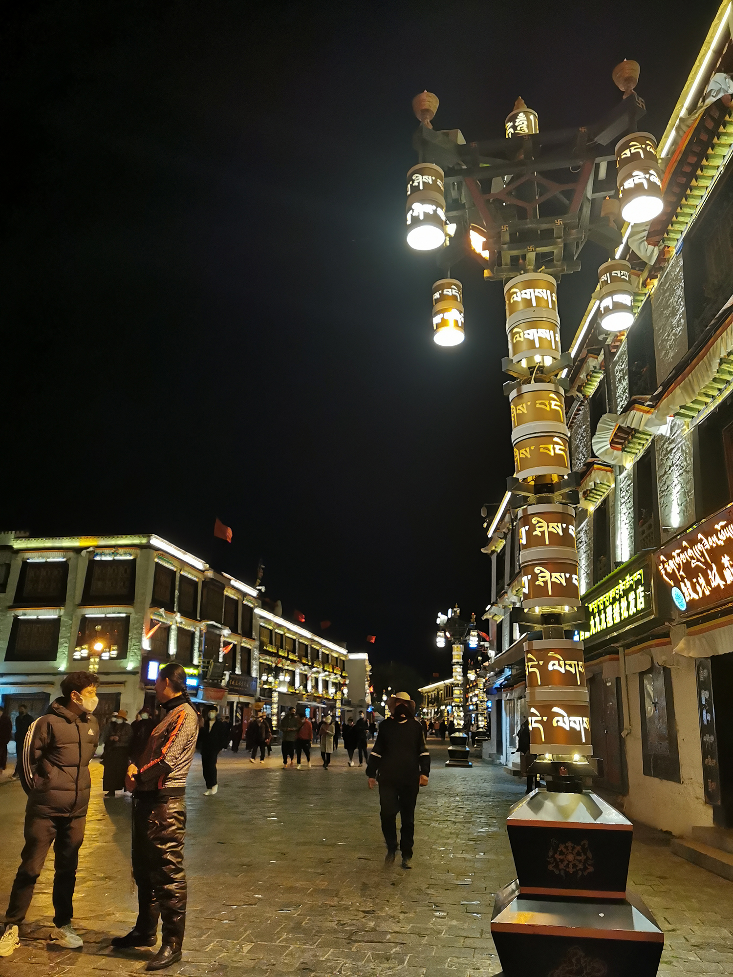 如果认真转过八廓街,会发现周边藏着一座气势不凡的清真寺。每当夜幕降临时,经典的星月顶在柔和的夜色里显得格外宁静,与不远处的布达拉宫和谐共生。整个清真大寺前面就摆起了清真市集,在这里你可以买到各式各样的清真美味小吃,不同民族、不同信仰的人们在市集上穿梭,品尝美食,场面热闹且温暖。
