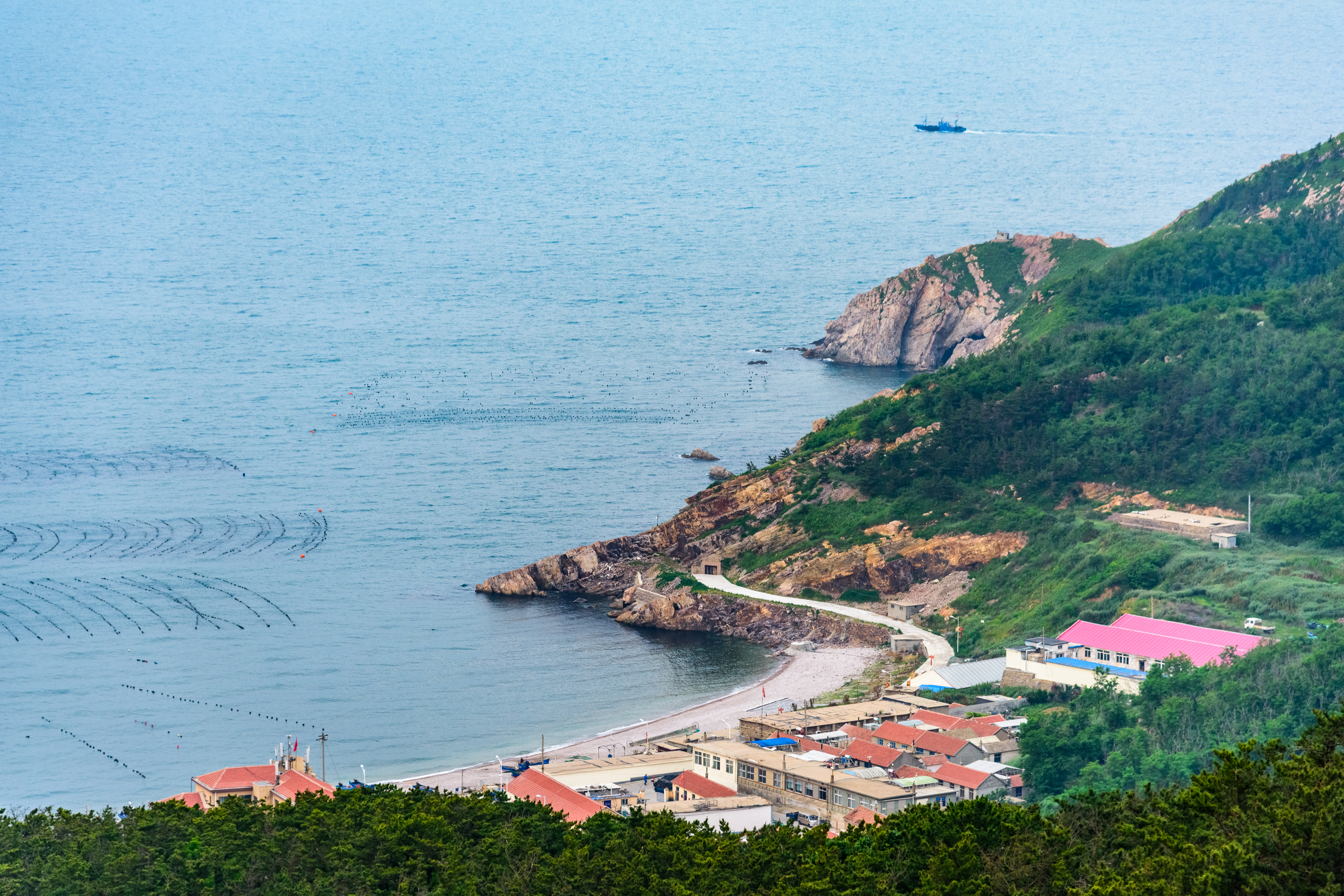 从灯塔山看山前村,前面的小岛是南隍城岛,再向前是小钦岛和大钦岛。