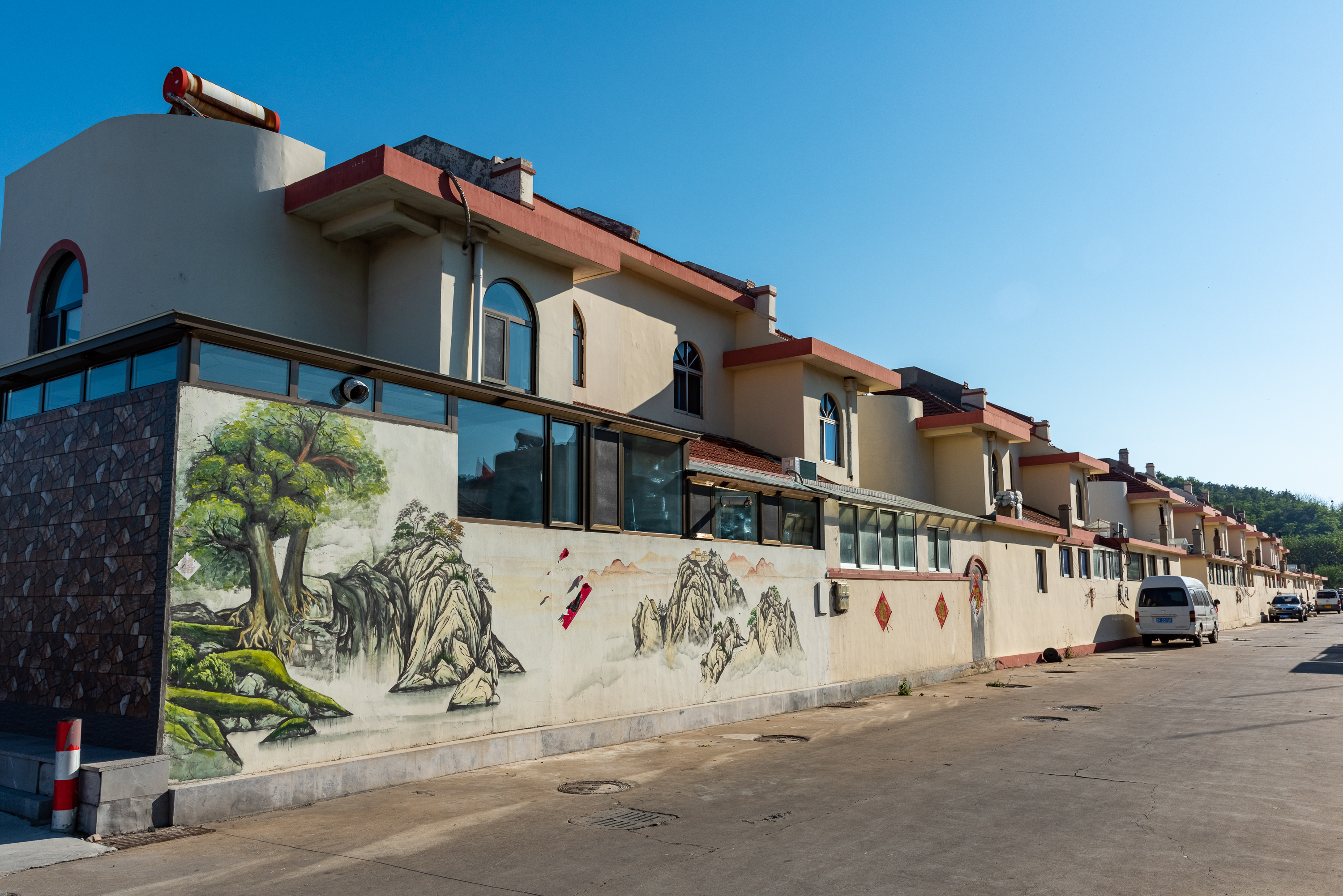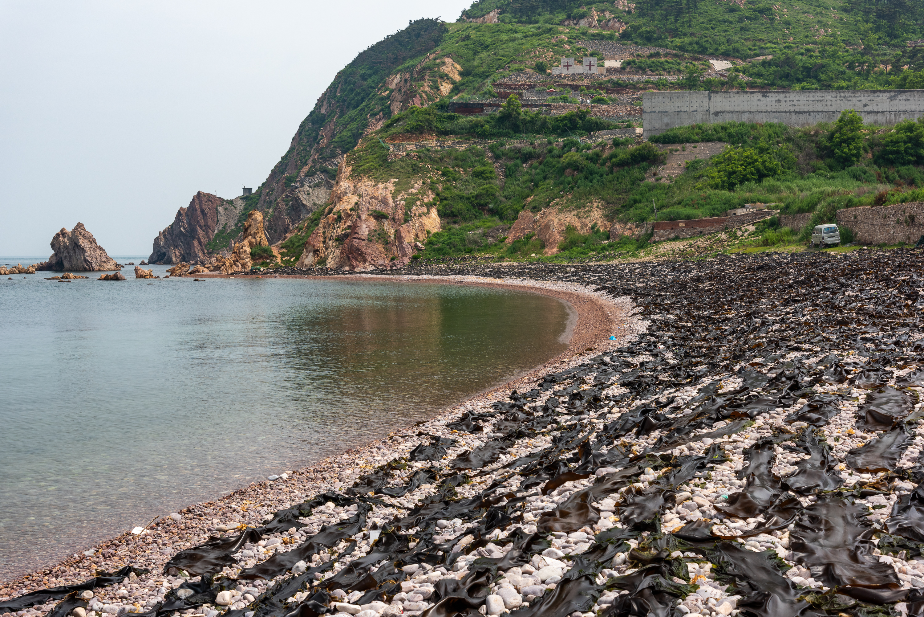 到渔家乐后离中午饭的时间还有一两个小时,就问老板周边可有随便走走的地方,老板推荐了北村海水浴场,走过去大概10分钟,我一个人过去,在那里见到了三四个游客。后来听老板说,由于没有游客,现在这里基本没有管理,暑假高峰时候能干净些。老板说他们小时候这个浴场到处都是漂亮圆溜的鹅卵石,比长岛的月亮湾的卵石更好,后来都卖光了,一船一船的往外拉,当年没有人觉得这些破卵石有什么用。