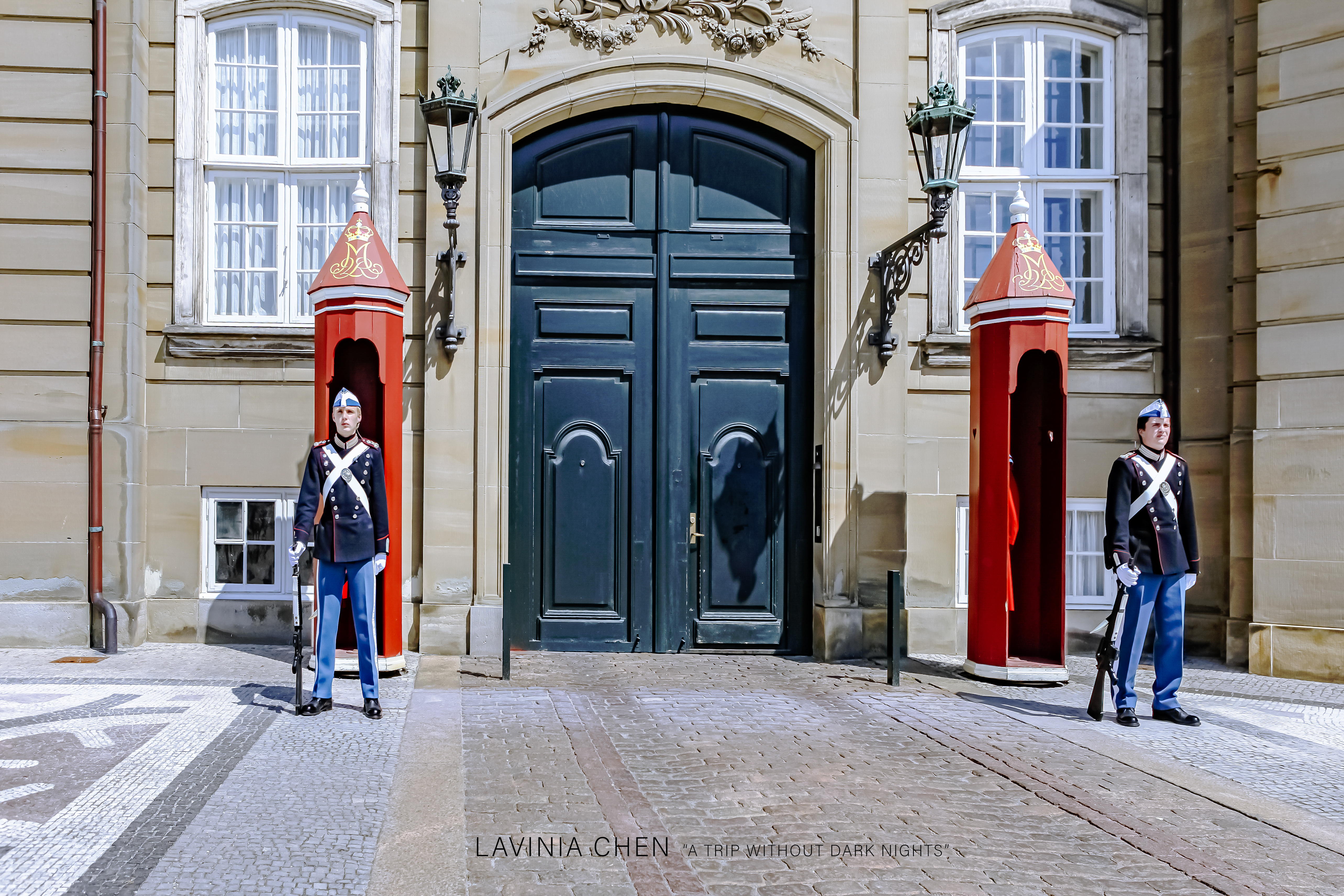 换班仪式在阿美琳堡宫前,阿美琳堡宫是丹麦现在的皇宫。与瑞典皇宫不同的是,丹麦王室还居住在里边。如果你看到广场上的旗帜是升起状态的,那说明丹麦女王正住在里面。