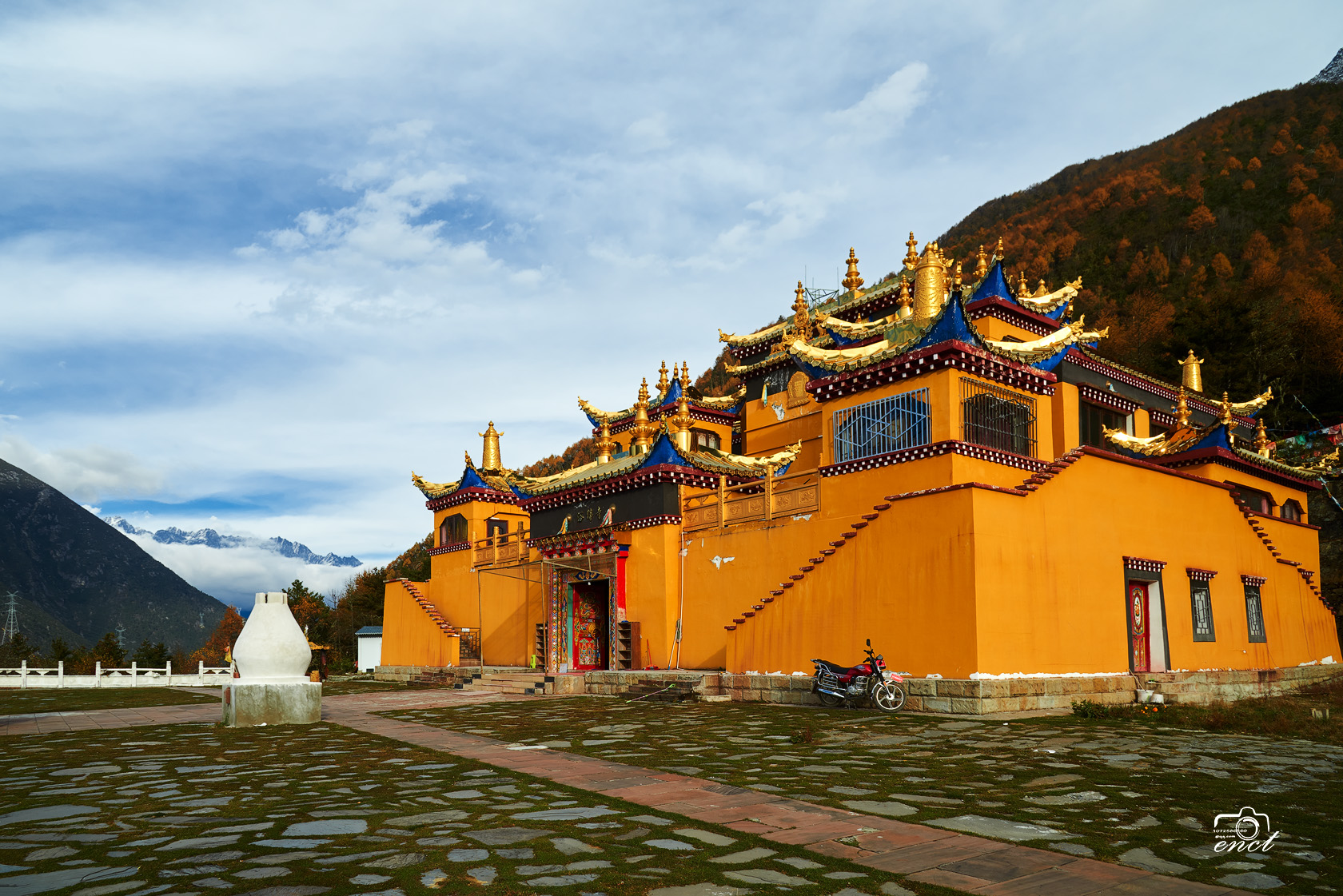 攀登山腰,我们看见了金碧辉煌的“浴佛寺”,虽然没有开门,外观也令人惊叹!跑马山九龙浴佛寺坐落于贡嘎群峰之中。据说佛祖释迦牟尼诞生时天上有九条龙为其沐浴,所以每年的佛诞节也是浴佛节。每年四月初八“佛诞节”,这里都会举行跑马山国际转山会,又叫浴佛节和晒佛节,这习俗早已成为康定地区最盛大、最具影响力的节日!故而跑马山成为了游客祈佛、许愿、加持、禅修、洗涤心灵的绝佳之地。