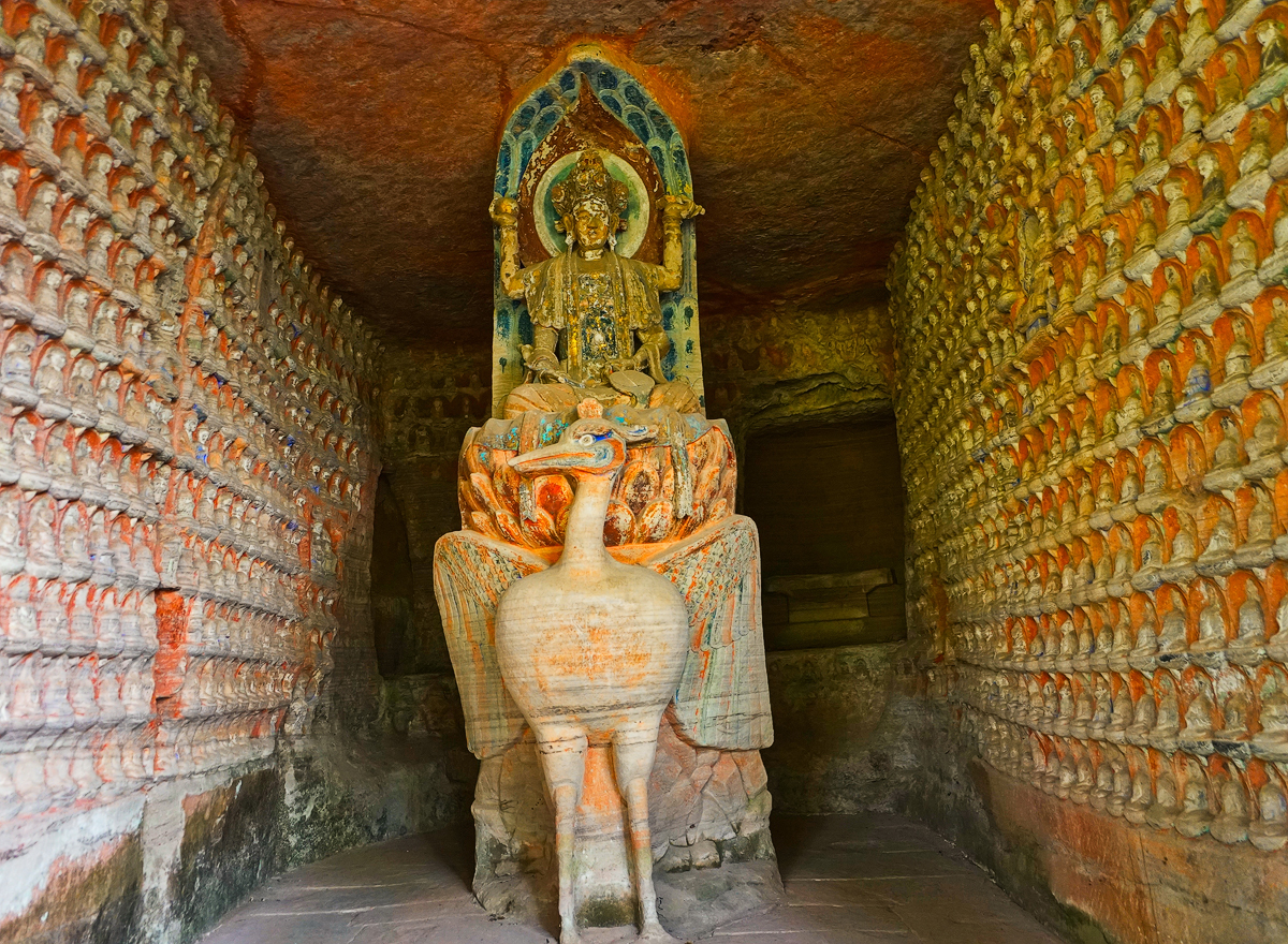 巴蜀石刻中经典的造像----孔雀明王经变相(宝顶山大佛湾第31窟)。孔雀明王造像精美庄严圆满,开凿于南宋。它贴金彩绘,头戴七佛宝冠,后有五彩头光。坐北向南,面容慈祥坐于孔雀之上,孔雀两翅张展,两侧的崖壁上雕刻了帝释天战阿修罗的场景。