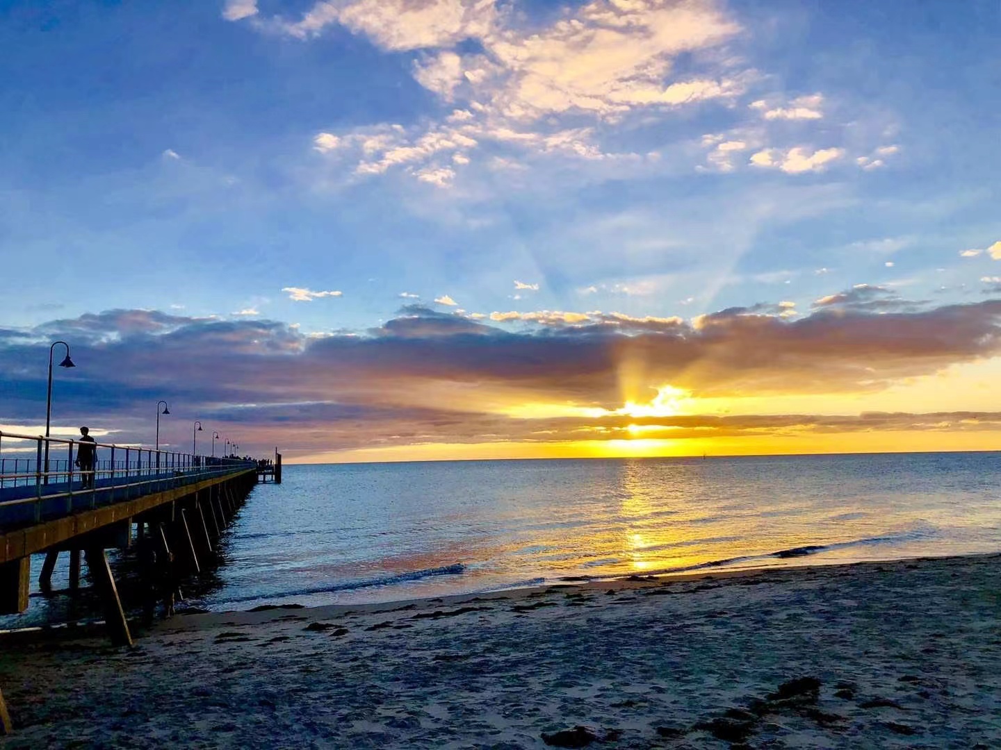 之后再黄金海岸的海边等待日落,晚霞染红了天际。