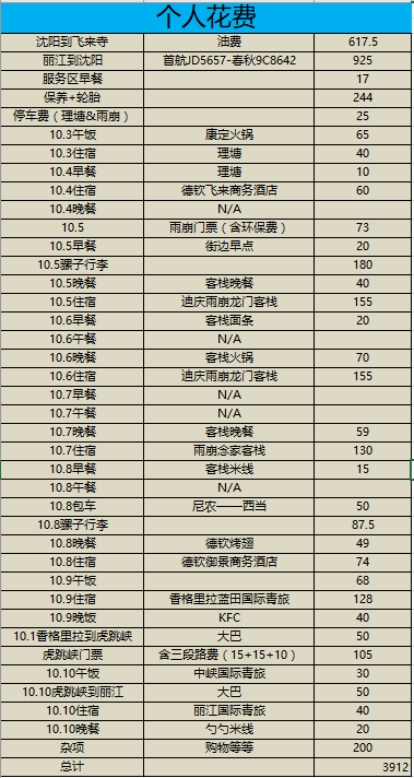 这可能是我出行最省钱的一次,可能也是最疯狂的一次,国庆期间免高速费省了很大一笔钱,长途奔袭40几个小时节省了开支也带来了不稳定因素,奉劝各位 自驾 还是以安全为主,疲劳驾驶很危险,下为详细花费excel,里边包含个人全部花费,可以自行划重点看