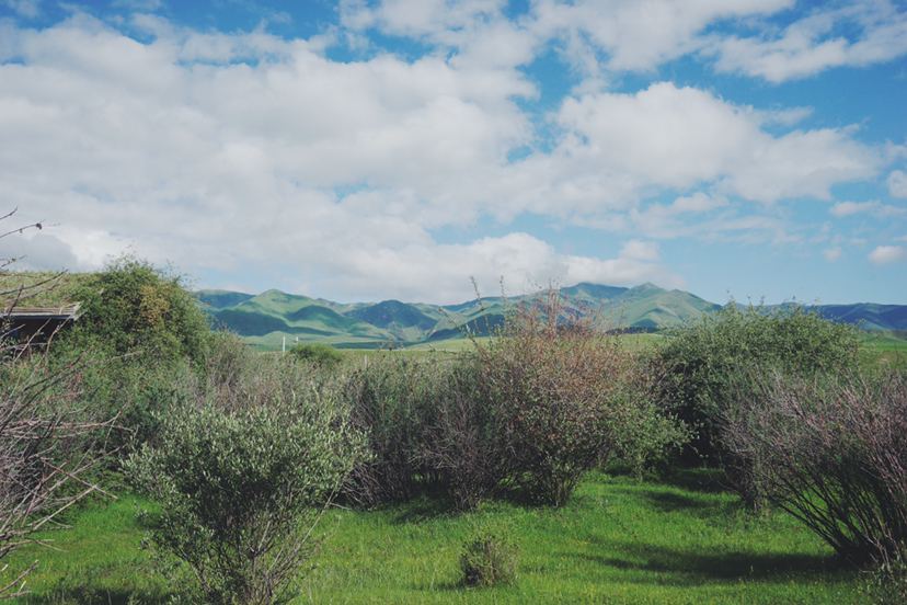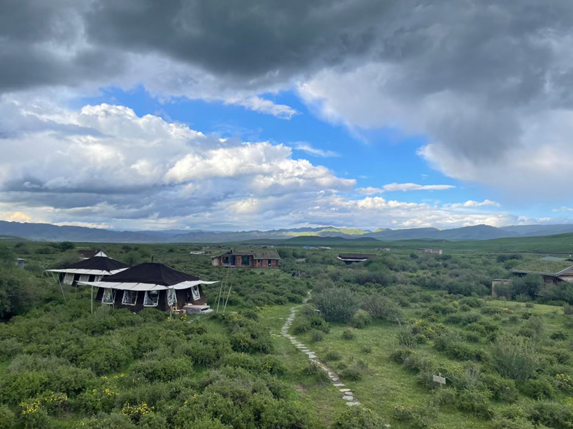 2022年6月26日中午,我们游玩甘加秘境后抵达了诺尔丹营地。营地隐蔽在桑科草原里的一小片灌木丛中,远远地看很容易错过,除了入口处高耸的经幡,从远处真的很难看出这里有一片营地。也正因为如此,诺尔丹完美地与自然融为了一体,这里的土壤、流水、树木、草原、花丛、鸟群、蓝天、雨水…都是营地不可或缺的一部分。