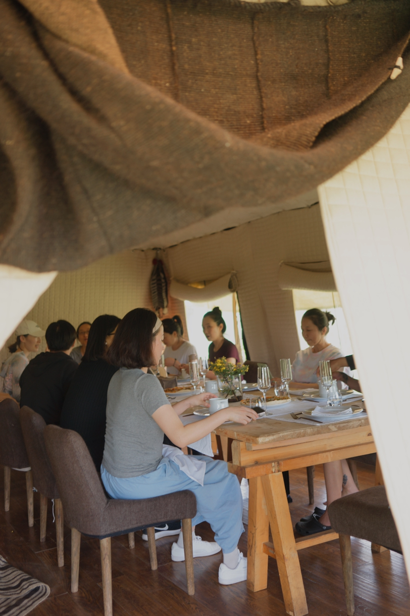 在洒满阳光的早餐厅,我们不仅在每次晨课之后可以错峰享用早餐,还在此想用了一顿新鲜丰盛的火锅。另外的正餐我们十人还可以在独立的帐篷吃, 服务的藏族青年个个经过专业培训,细心贴心,总会问我们“有没有吃饱?要不要加菜?”特别像在亲戚朋友家被很好地照顾到。
