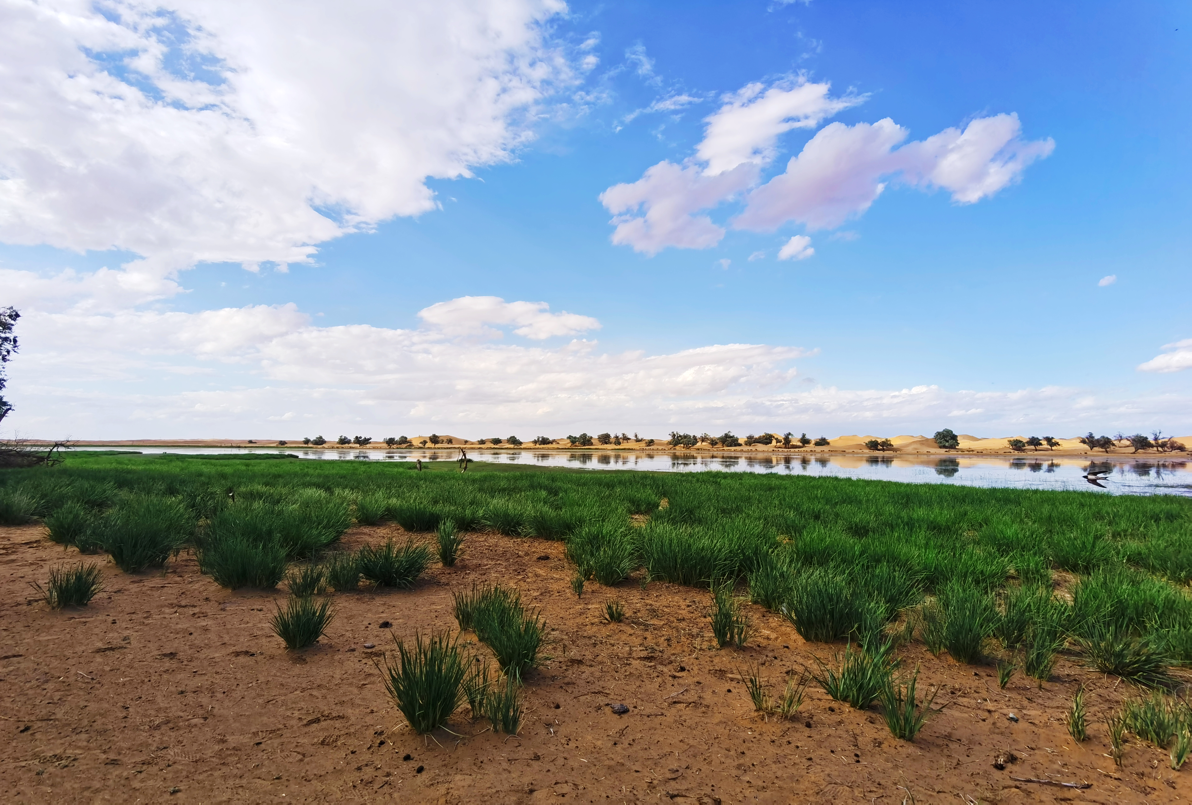 天鹅湖湖水是正常湖水的颜色,天鹅湖的边上是连绵的沙丘,地市低的地方绿草青青,非常漂亮。