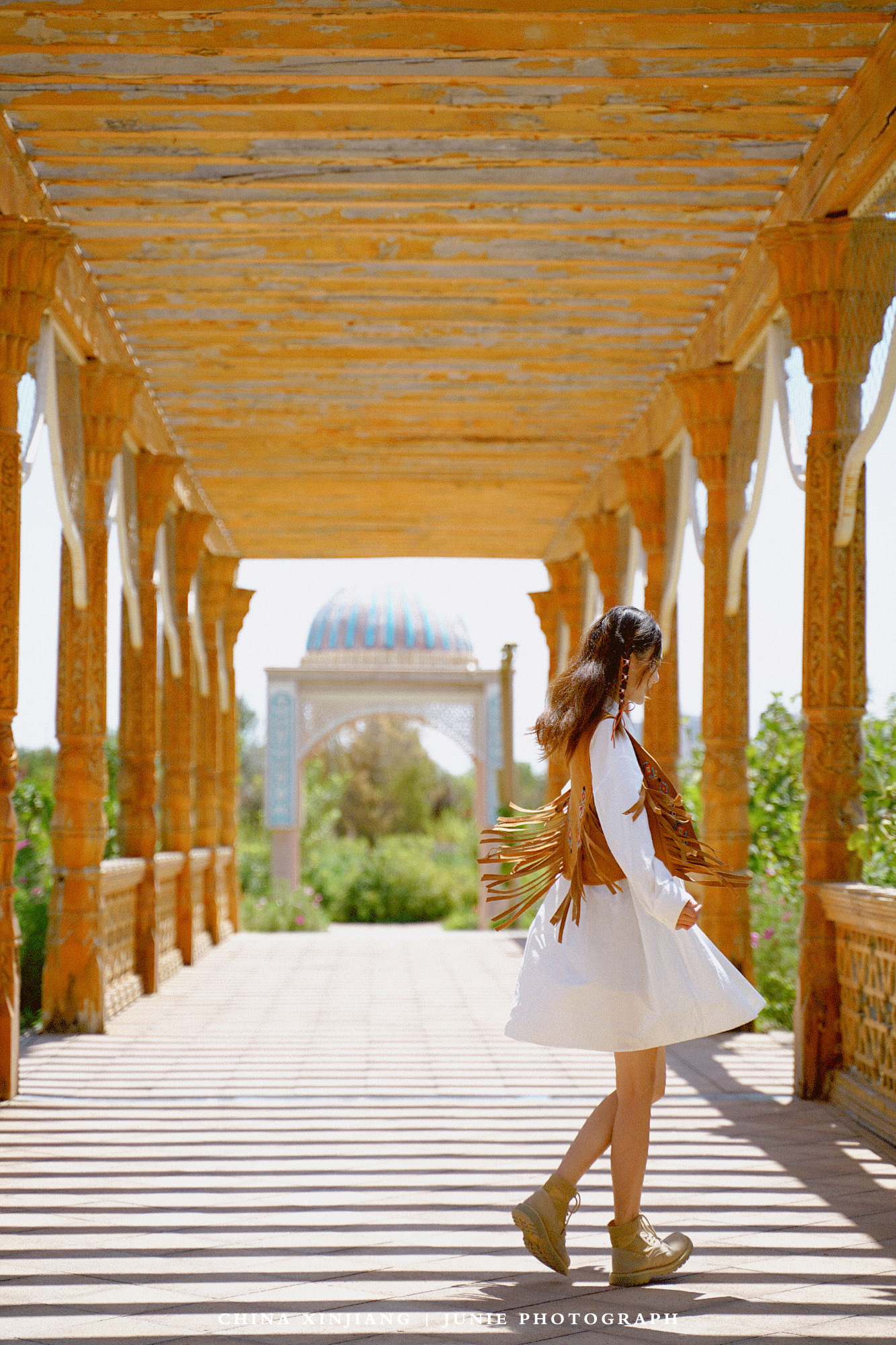 香妃园、牛羊巴扎等地的穿着,有西部牛仔风,浪漫转圈时也有飘逸感,可佩戴上草帽遮阳