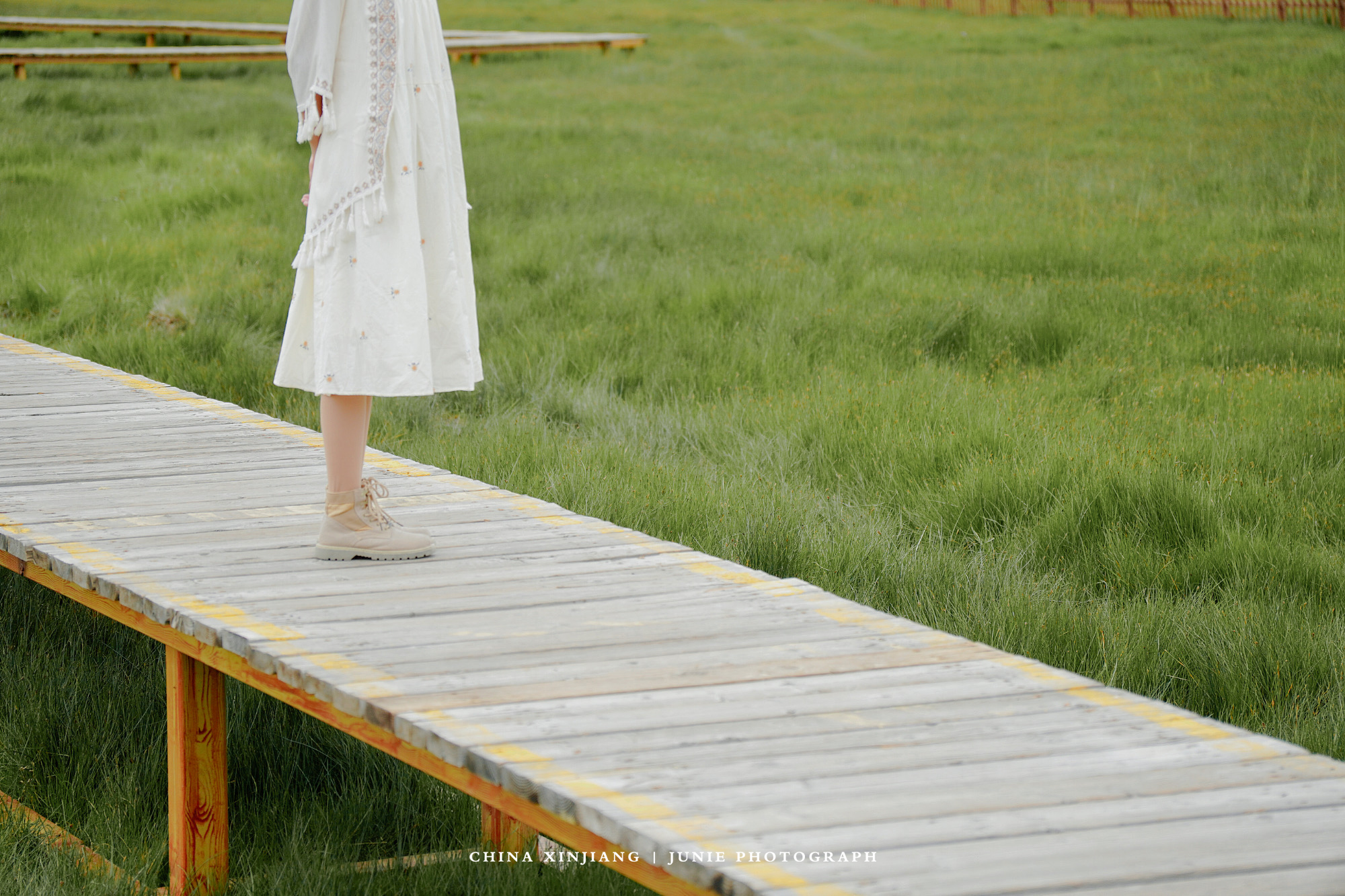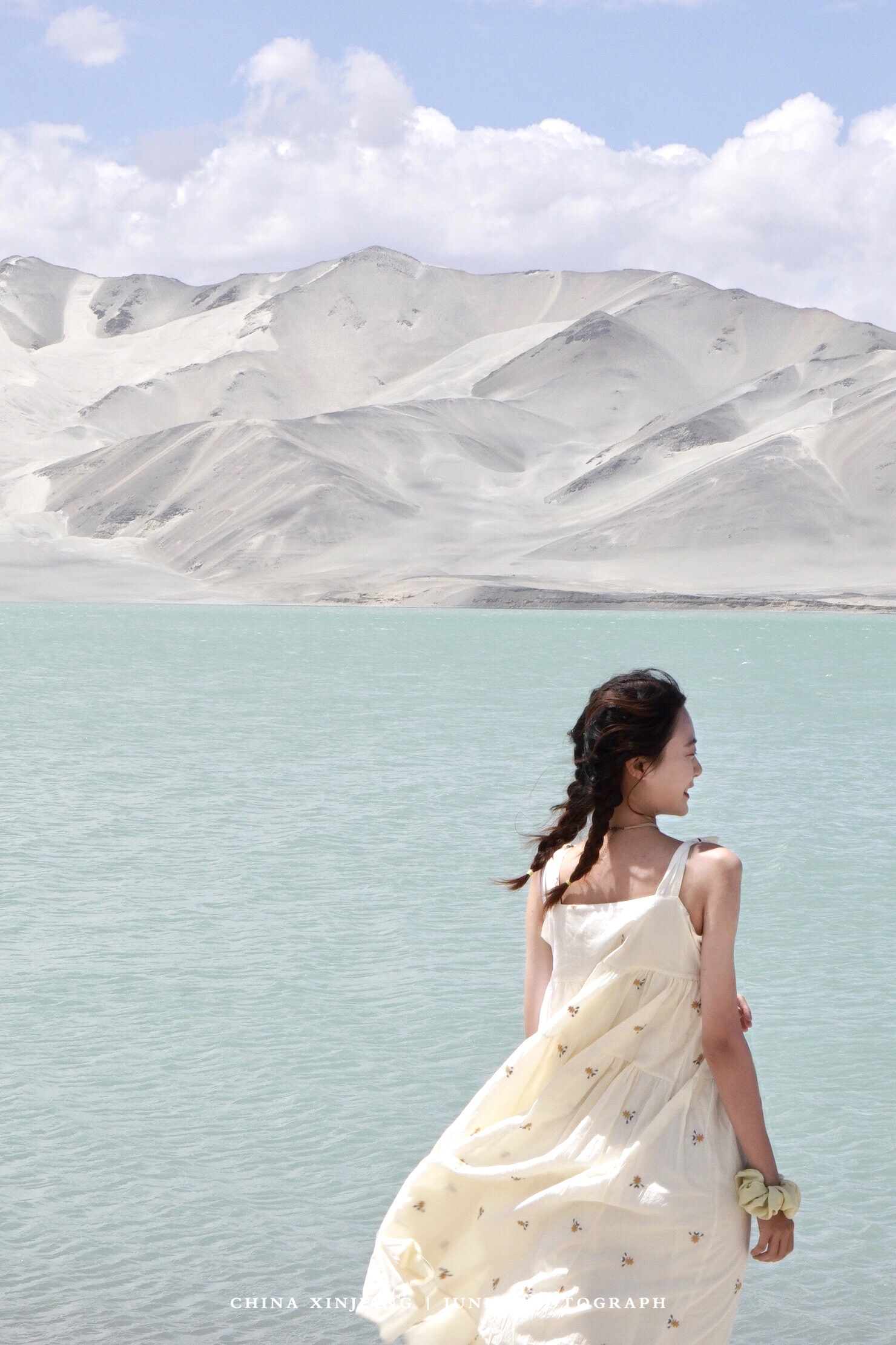 白沙湖、金草滩的穿搭,纯粹的白裙就很适合这一抹梦幻蓝的湖面和草原风光