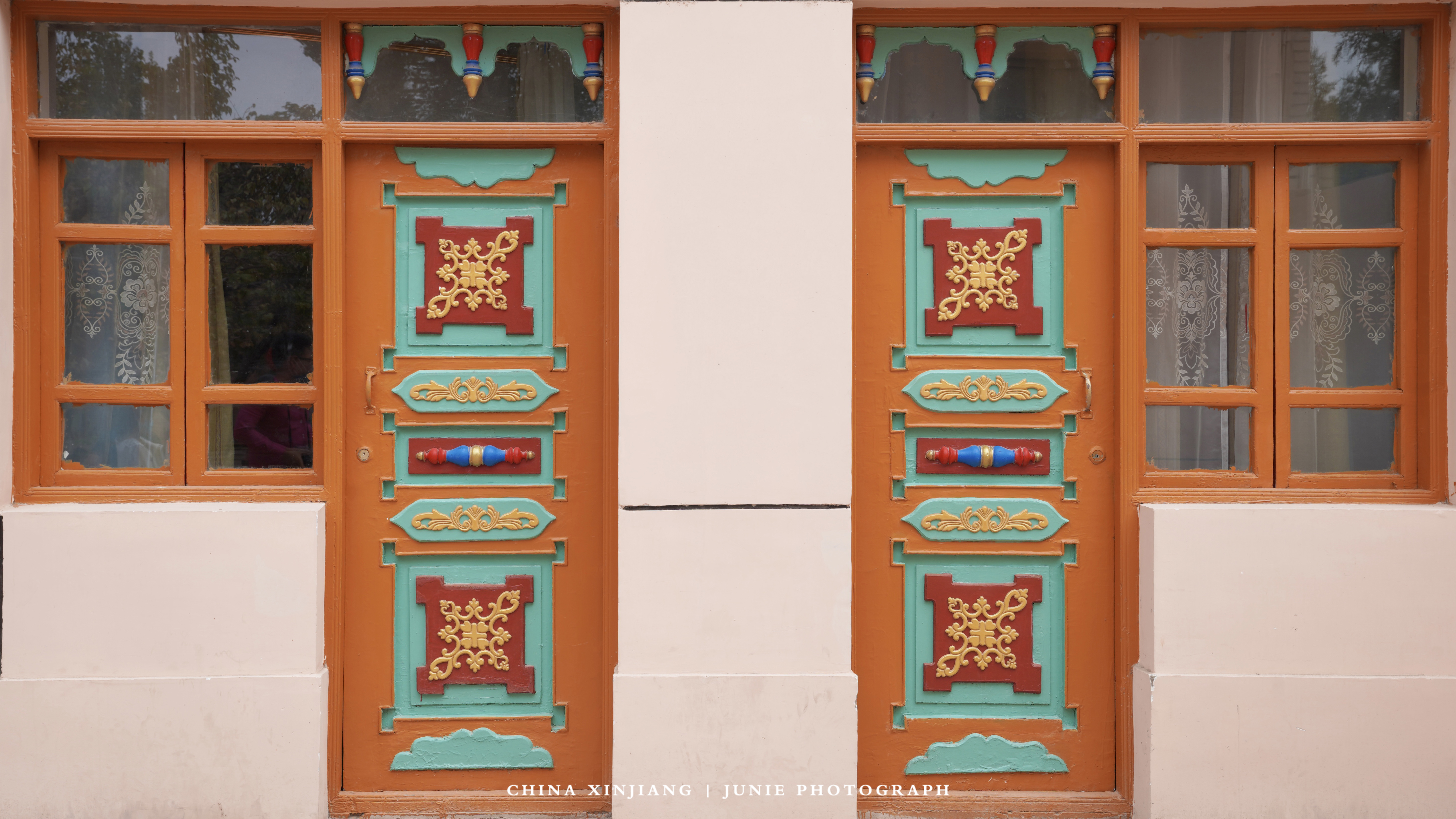 在库车或莎车都是选用了这个穿搭思路,彩色的街道门廊最好以彩色去搭配,搭上一件白色外套就不会撞色或融入背景墙了