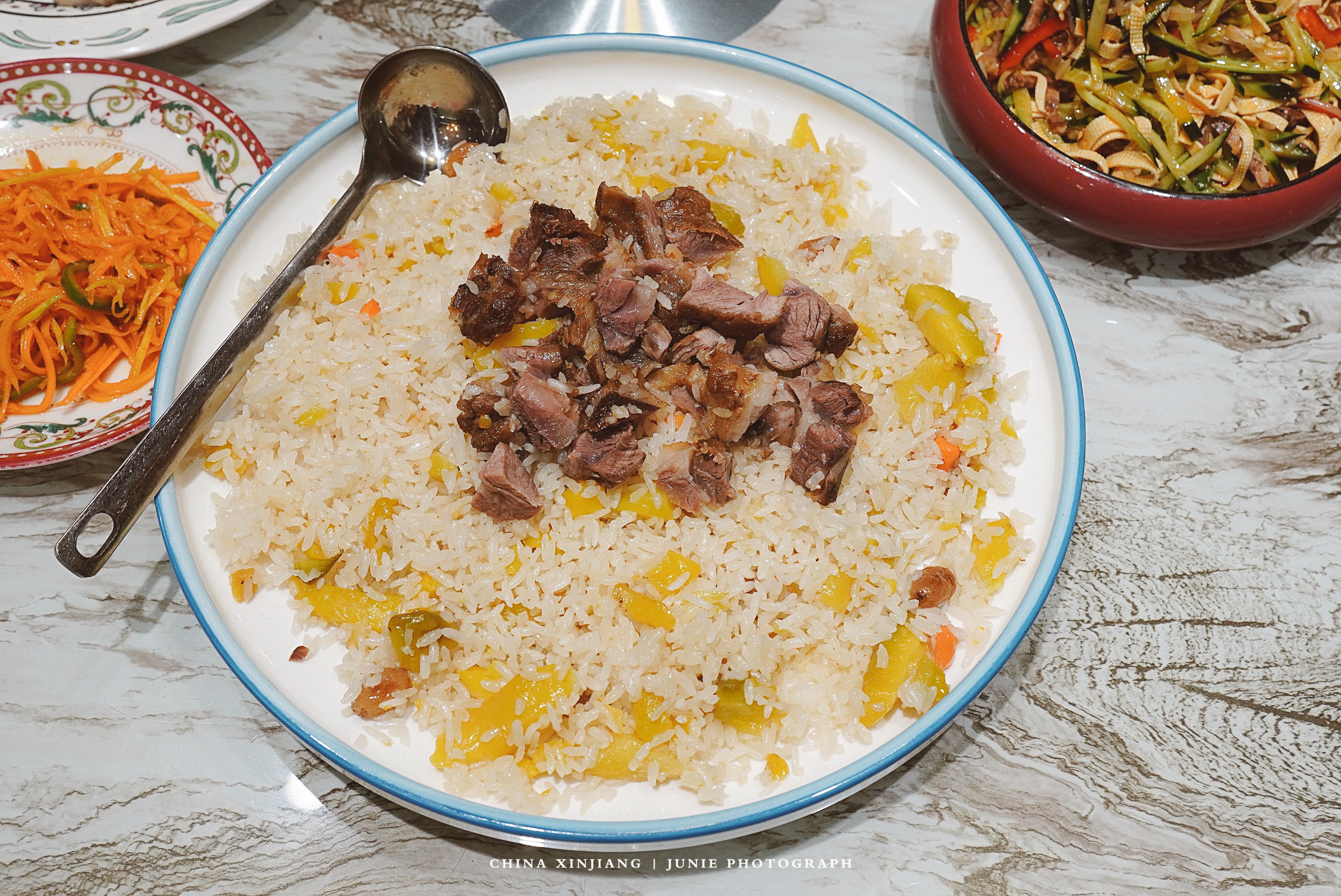 -手抓饭:手撕的羊腿,配上胡萝卜、洋葱等蔬菜,香气四溢又滋补