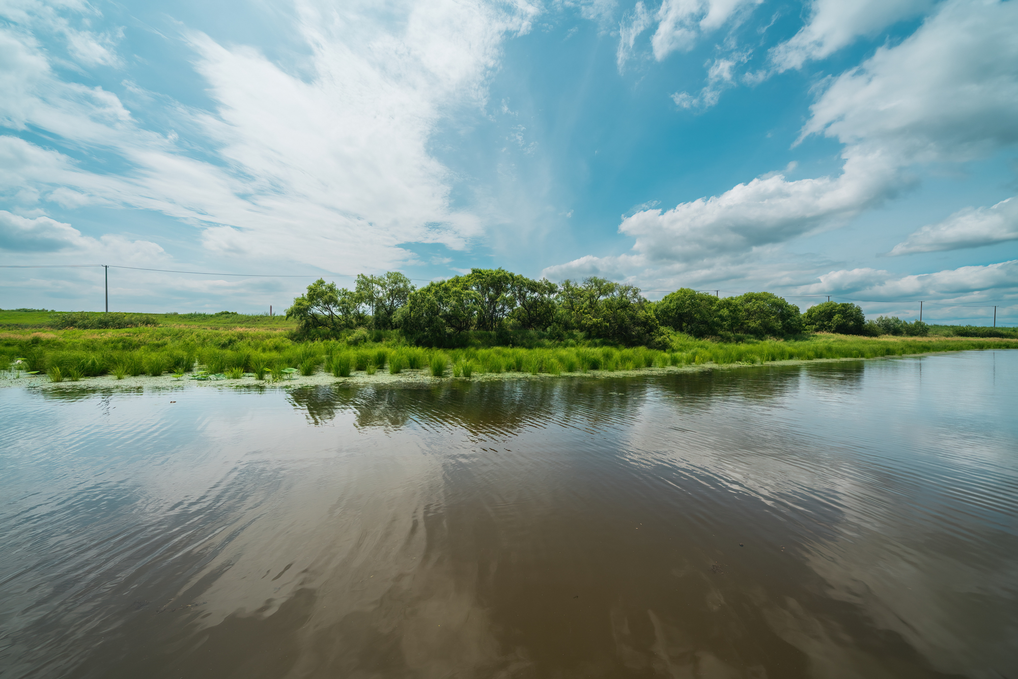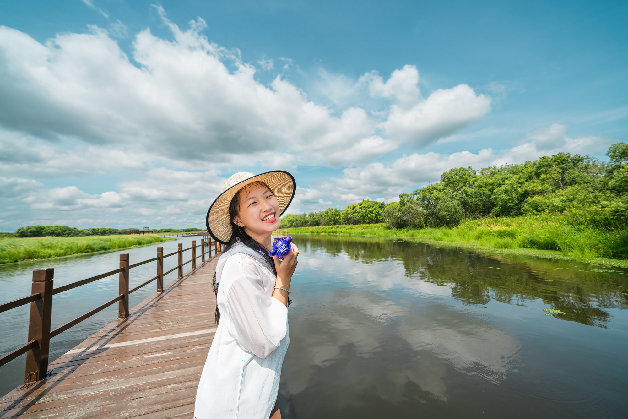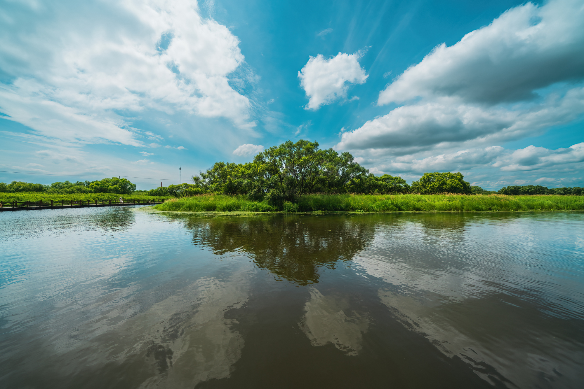 游览湿地必走通岛浮桥。湿地与植被相映成趣,七月中旬,这里正盛开着片片荷花,天空白云悠悠,一切都是大自然的馈赠。