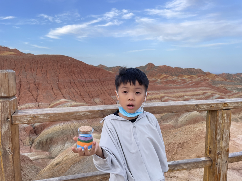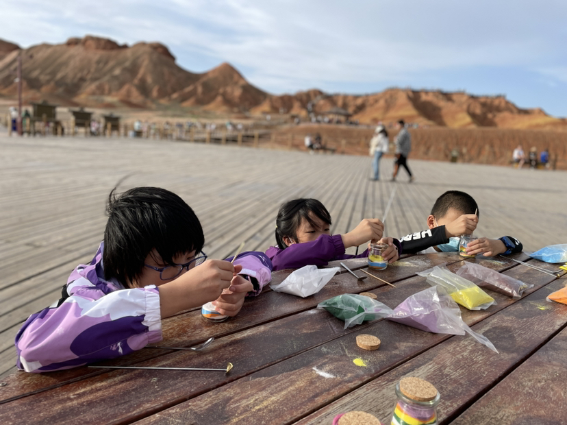 每位小朋友需要在七彩丹霞找到7种颜色,记录下来,在七彩丹霞旁进行彩色地质瓶制作