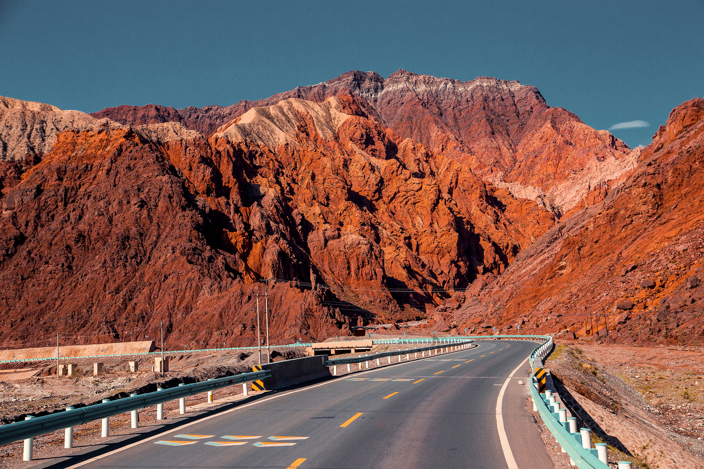 这是一条真正的高原天路,横卧于昆仑山脉帕米尔高原,广袤、壮观,黝黑的柏油路面的公路与带着颜色的山体完美结合,再加上远处连绵的雪山,这样的盛世奇景只属于帕米尔,这是只属于新疆的壮美山河。