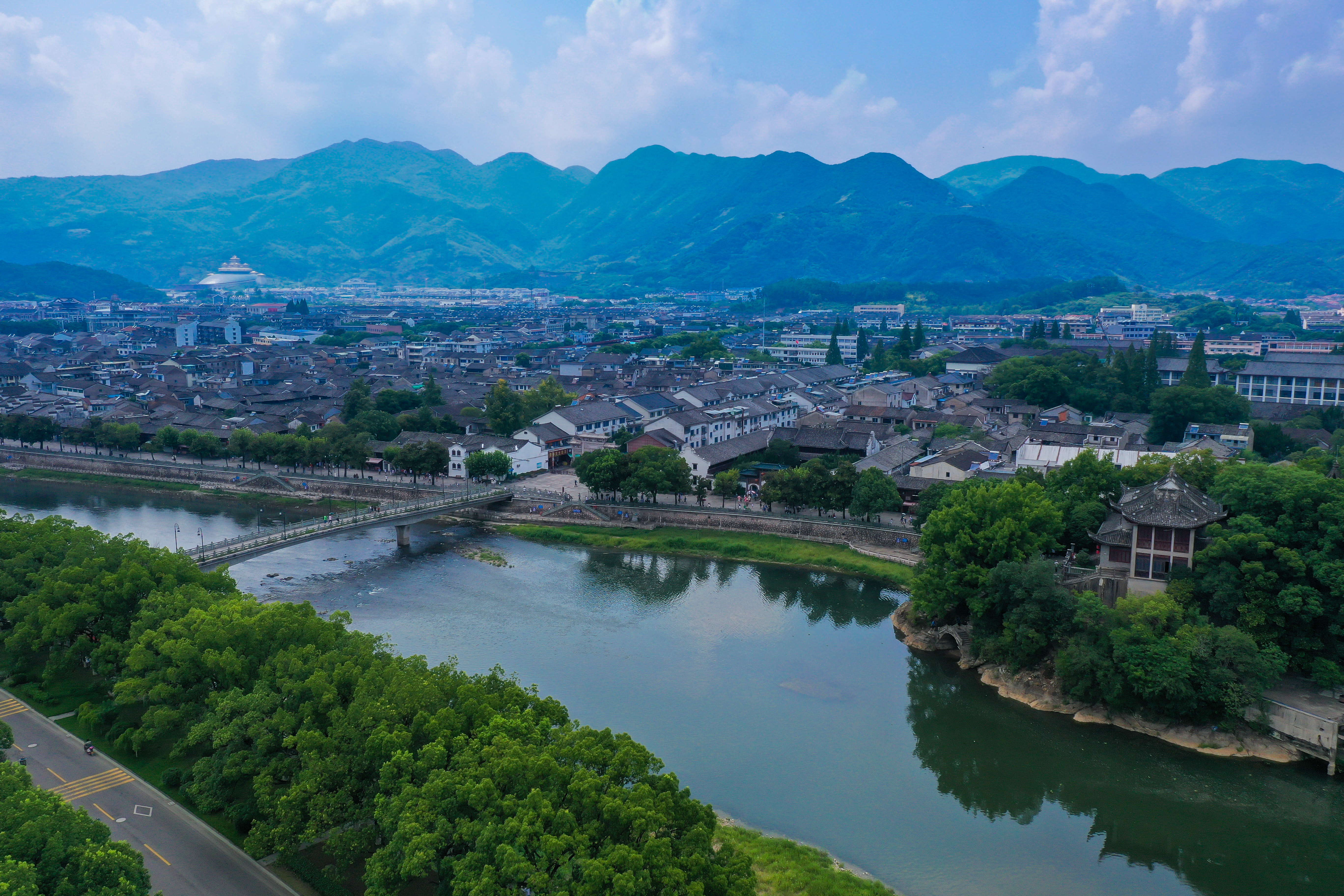 岭门就是溪口镇了,三里长街与蜿蜒的剡溪相依相伴,右边是武岭学校,左边是文昌阁。